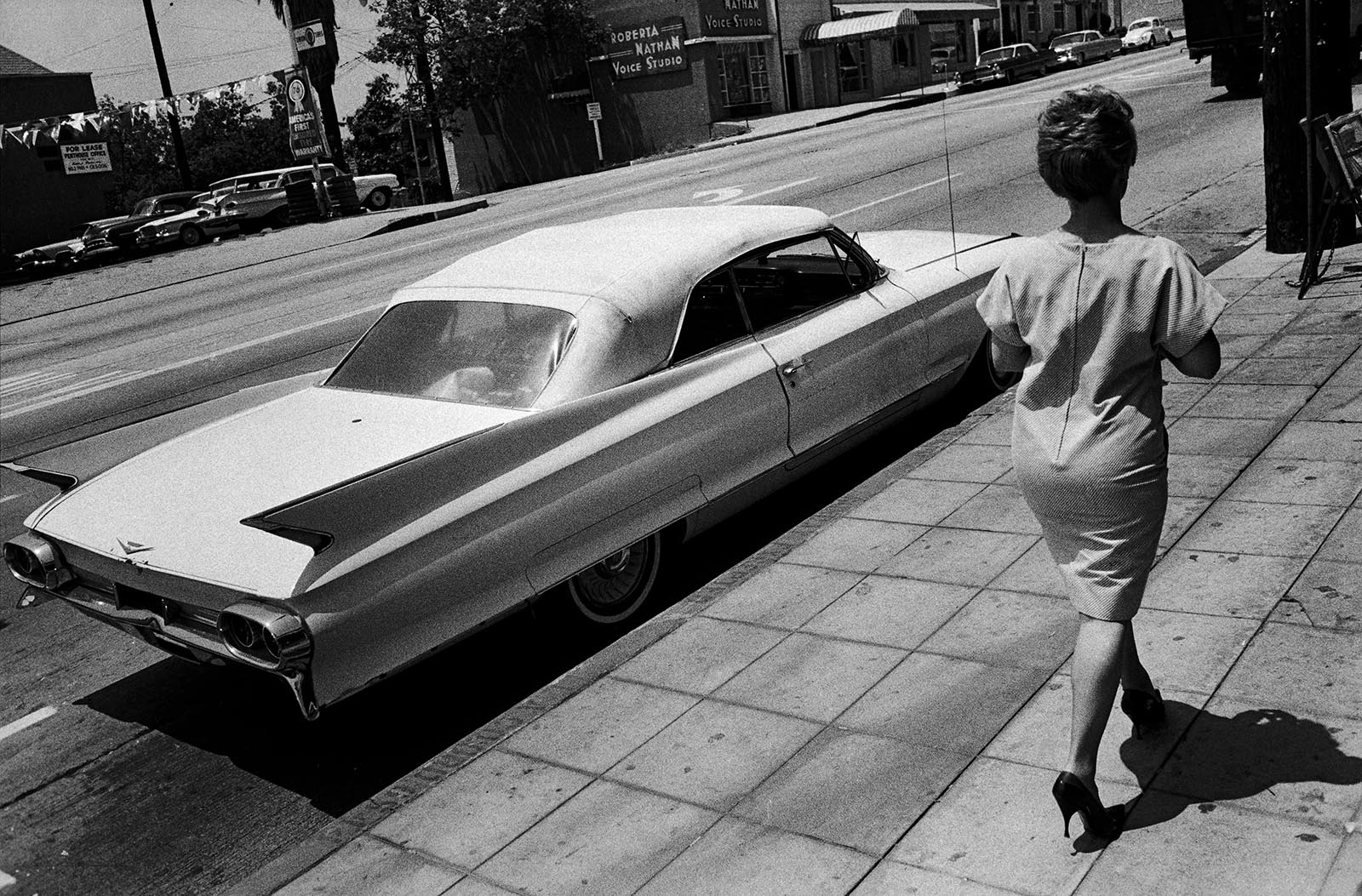 This is a golden age of vast shimmering freeways where beautiful women drive in polished convertibles, drive-in burger joints are the chapels of youth culture, and palm trees still thrive unchecked in the desert, irrigated by faraway reservoirs. Even in this chromed veneer, the pictures find a hollow interior in the city’s people and places, capturing them when their guard is down and materiality shows through.