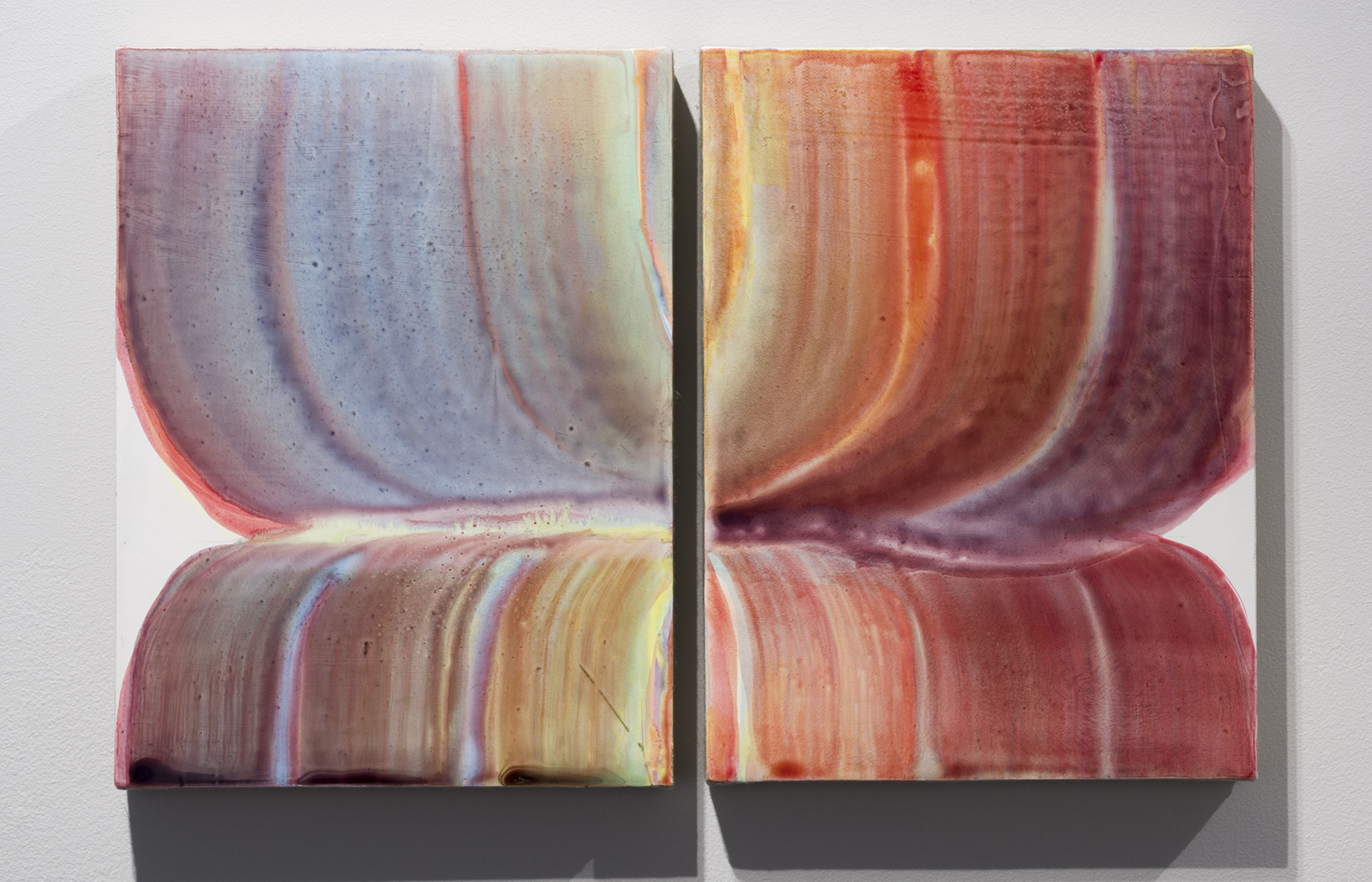 In “Forever Like Kindly Friends,” two small paintings are displayed next to each other. As the title references, these pieces act as a visual dialogue and most likely represent the conversation between two people; the lip-like forms are not hard to miss. There is a certain softness evoked by the cool and warm hues, almost skin-like. The ways the colors flow across the linen are very reminiscent of Morris Louis and artists of the Washington Color School.