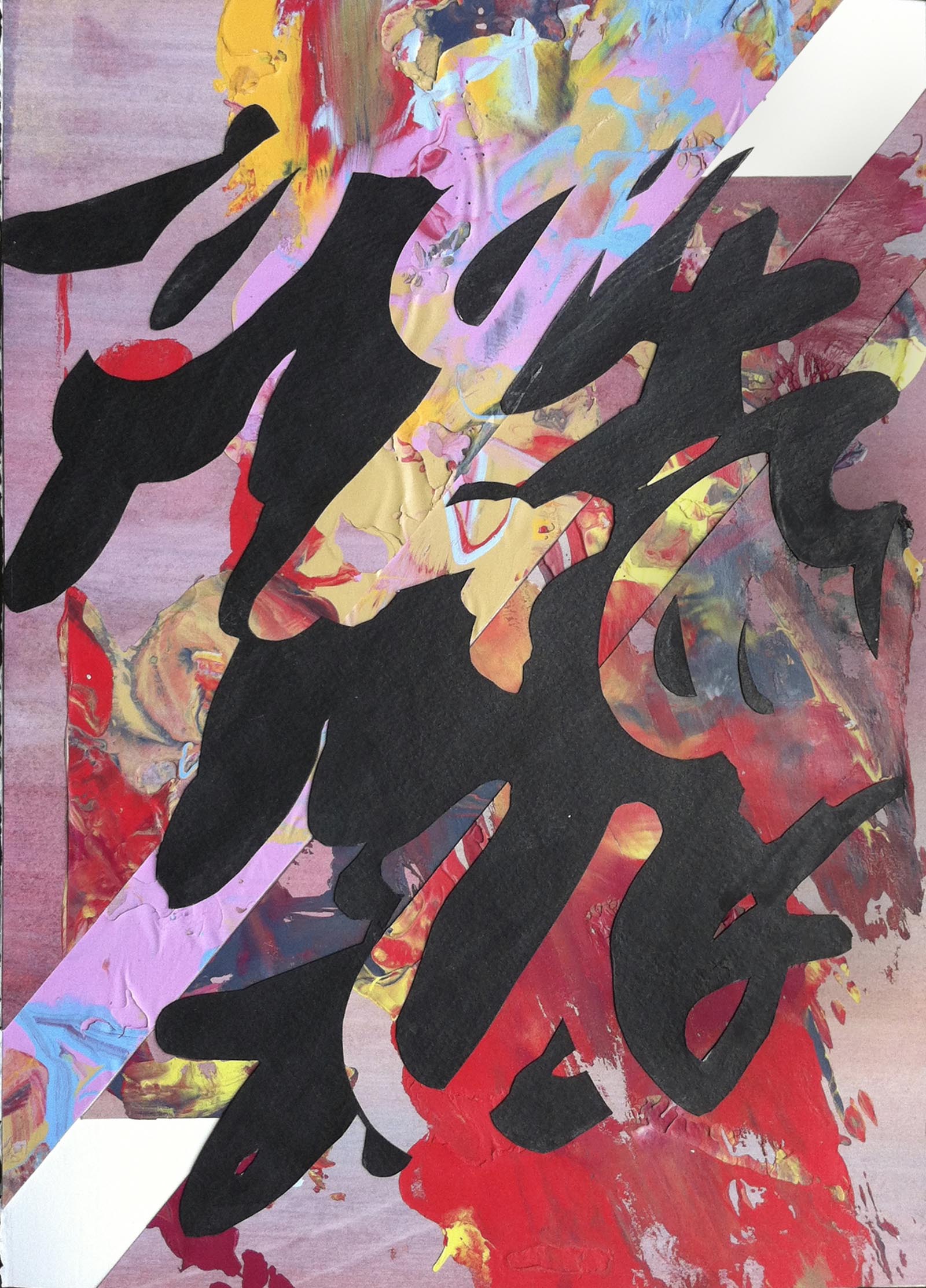 In his Wildthing paintings, Pankratz adds a number of black shapes into the composition to enhance and counter the vibrant colors. What may appear as intrusive in fact adds a new element to the surface. The black shapes shimmer due to the graphite mixed into the paint and add dimensionality to the flat surface.