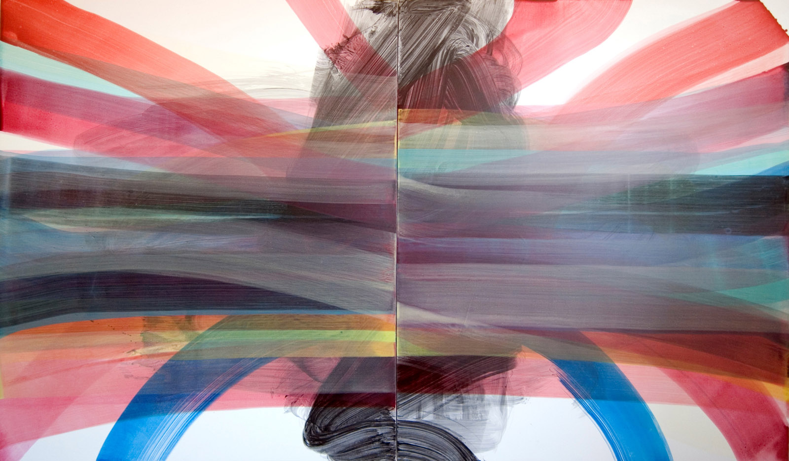 The largest piece in the show, and my favorite, is “Reading Two Books At the Same Time”. The mop-like, broad horizontal brushstrokes against a glossy surface are quite calming, and they create an iridescent spectrum of cool colors that is as soothing as untouched water.
