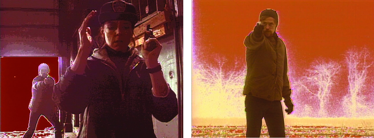 The Homeland intro was all to familiar for still another reason. Between real-life Paris reports and TV’s Homeland, I went to a screening of “White Homeland Commando” at International House. “Commando” is the Wooster Group’s 1992 groundbreaking digital-video parody of TV cop shows like Hill Street Blues and Law & Order. “Commando” tells the story of a New York wing-nut political cell infiltrated by police. The police and their targets all perform similar activities and behave erratically and irrationally in similar ways. The action is circular, replayed over and over with the actors switching who’s talking to whom inside a smoky room, who enters with a gun, etc. By the end, no one is left standing. Michael Kirby’s script is not so much a plot as a series of conversations, their circularity reflected in a series of visual motifs—not only surveillance-like black-and-white grainy jumpiness with crackling sound, gritty scenery, and compressed, depressed spaces, but also unreal, brilliant swatches of color laid over sections of the grim cityscapes. The color interrupts and redefines the gritty spaces with a gorgeous calmness.