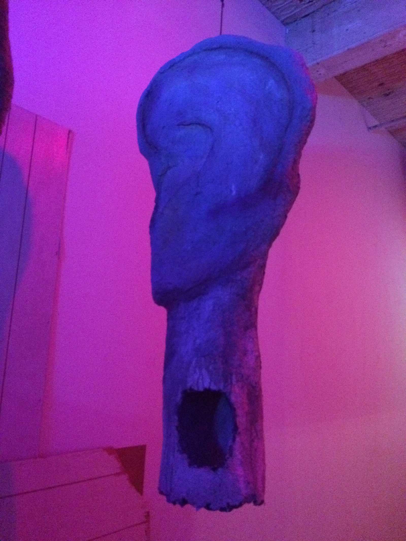 Marginal Utility’s David Dempewolf places Wick’s animations in line with those of the prominent South African artist William Kentridge and the performance work of Simon Forti. I think the analogy to Kentridge is particularly apt, although Wick’s work is less political and subversive than Kentridge’s. You may recall Kentridge’s 2010 production of “The Nose” at the MET, adapted from the Shostakovich opera based upon the story by Gogol, which features a man separated from, and searching for, his nose. As to which Kentridge has remarked that the absurd, with its rupture of rationality and of conventional ways of seeing the world, is really an accurate and productive way of understanding the world. I think much the same can be said about Ashley Wick’s work. Indeed, the centerpiece of I Lost My Head is a piece entitled “Ear God: Mystical Shortcoming,” and one of her hanging papier-mâché sculptures is a giant ear headdress which you can slip your head into, embody and experience. See below, and as demonstrated here: