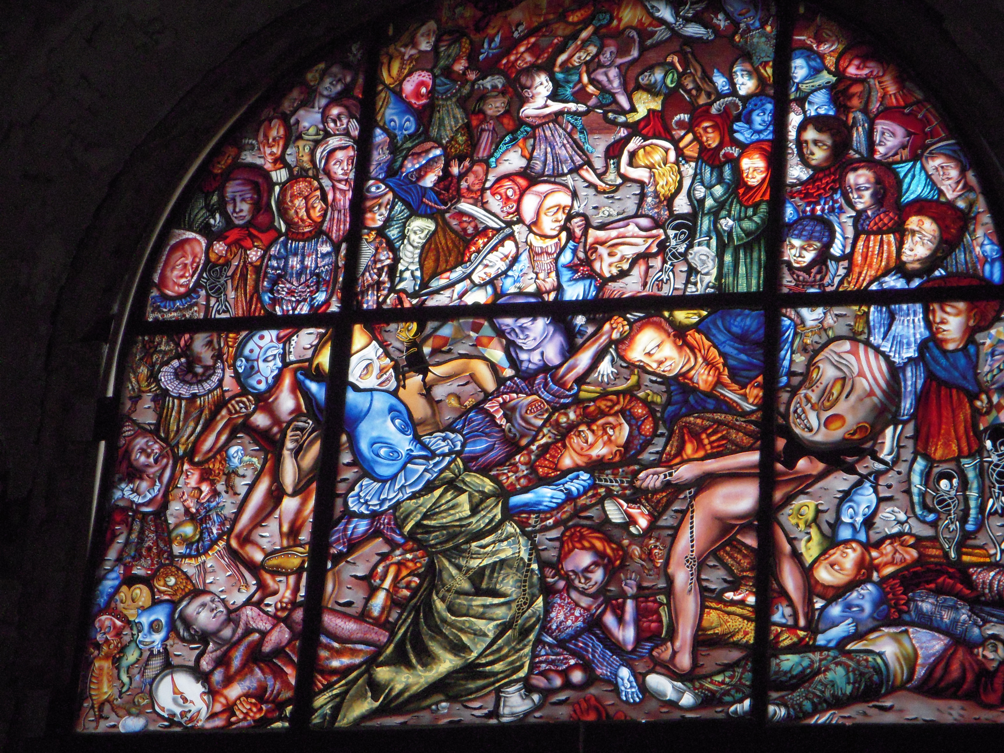 Via Claire Oliver Gallery…Congratulations, Judith Schaechter, beloved maker of dark stained glass fantasies that are like nobody else’s stained glass in the world! Schaechter’s glorious piece, “The Battle between Carnival and Lent” has been purchased by The Memorial Art Gallery, Rochester. The piece debuted in 2011-12 at Eastern State Penitentiary (read my story about the piece from 2012).
