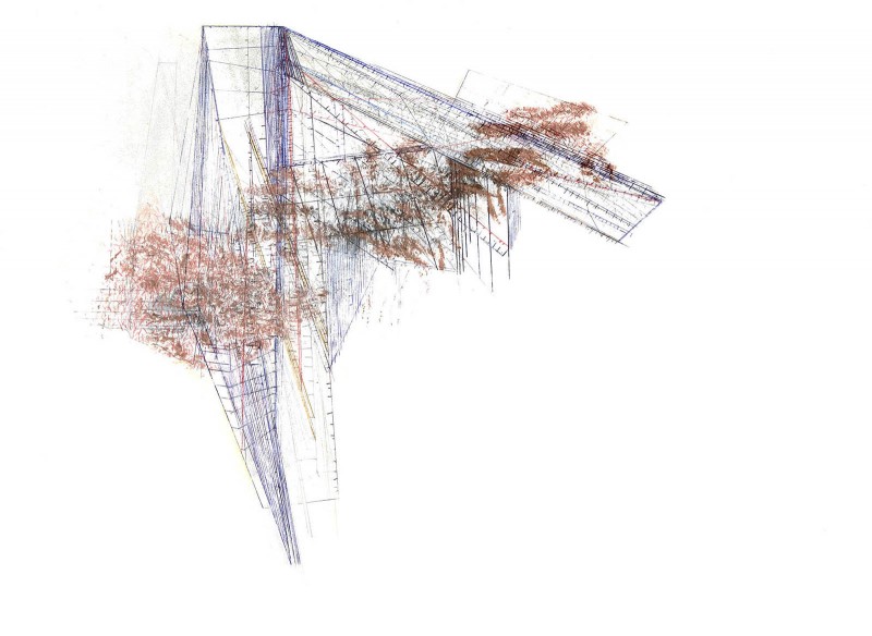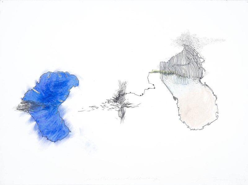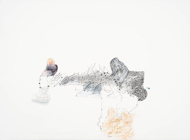 For the first time in Philadelphia, Joan Tanner’s (1935- ) work is on view at Locks Gallery through Jan. 30. Having exhibited extensively in California since the 1960s, Tanner is a prolific artist who works with various media—concrete, building materials, oil stick, colored pencil, video, and photography—to generate large-scale sculptures and two-dimensional imagery. At Locks, guest curator Julien Robson selected works on paper from three series: Drawing Focus (1999), donttellmewhereibelong (2013-2015), and endofred (2015). Through the body of work, Tanner explores pictorial space in an abstract landscape, juxtaposing the ephemeral and the concrete: organic matter and industrial apparatuses, migratory transitions and grounded structures, suspended forms and tethered elements. I was not only intrigued by the compositional complexity of the works on paper, but by their poetic nuances, their imaginative scope, and their contemplative yet somewhat distorted constructions. Tanner’s imagery conveys a sense of beauty in the midst of strained conflict, a metaphor perhaps of the relationship between the natural world and human-derived systems.