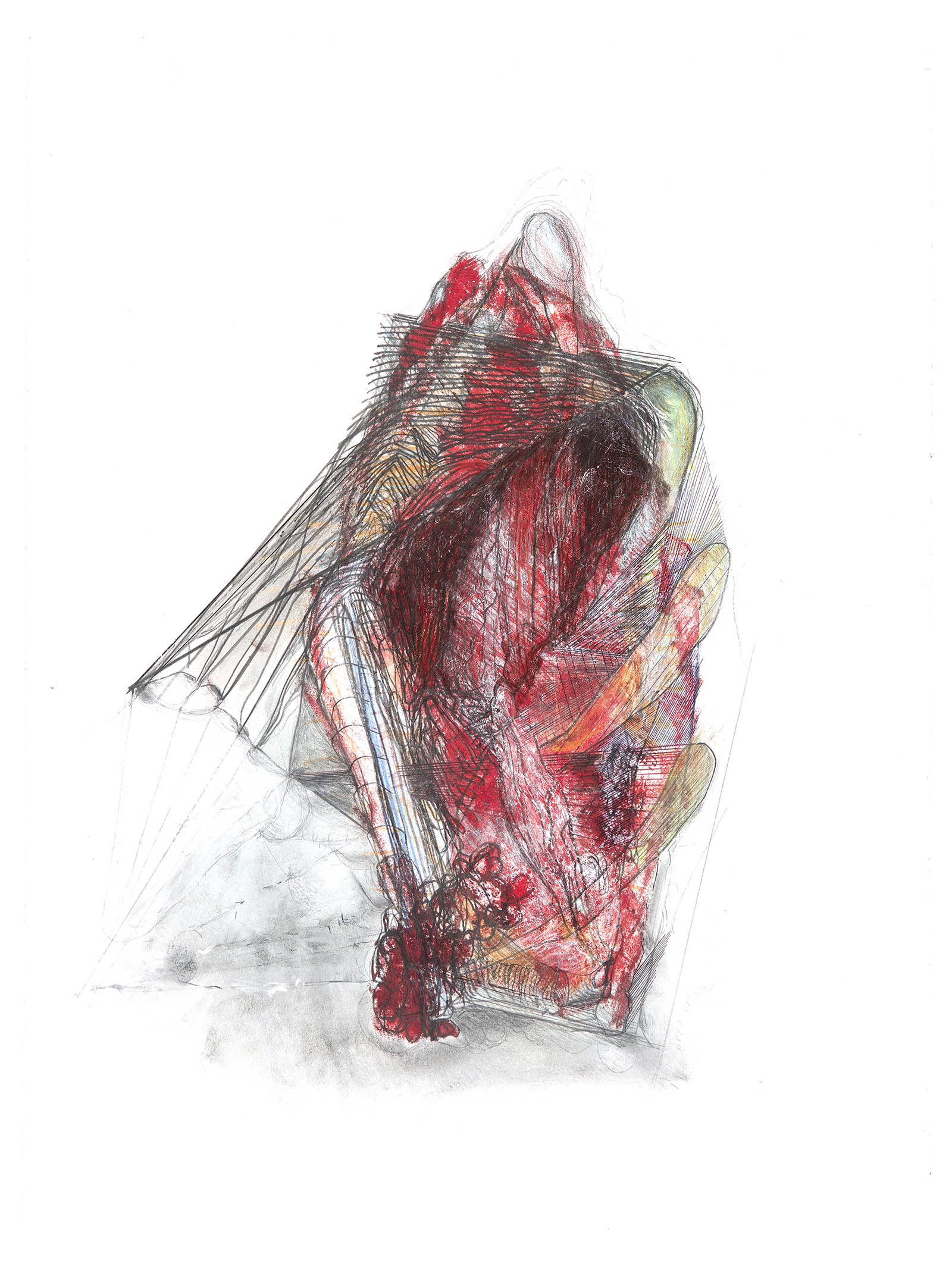 A straight-edged grid in donttellmewhereibelong #20 and #24 emphasizes a stringent aspect of human intervention. Compositionally central, the structural devices contain organic forms. In #20, a delicate architectural drawing of a steeply pitched roof-like design overlies umber marks resembling a forest of trees. The scumbled brown flecks indicate foliage during a moment of decay, and, with the absence of tree trunks, they float on the page unmoored by roots. The trees extend horizontally, but are not beyond the reach of the severely vertical exterior. In #24, sinuously shaped insect wings entwined with a human leg and foot (a toe appears on the bottom right) remain encased in thick pencil lines that hint at a geometric shape. The wings attempt to extend, but ultimately conform to the arrangement the graphite strokes delineate.