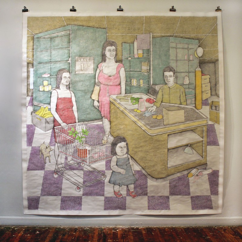 In “Grocery Shopping,” notice the almost empty shelves, the baby bottles on the floor, the doggie and the strange people, especially the child, each captured in their own private universe. This, like all of Ward’s work exhibited here, comes out of a strange time and place. It’s certainly not Whole Foods, but perhaps some dream-version of Kansas in the middle of the 20th century. Ward has suggested that his work may be understood “as commentary on the inconsequential activity that constitutes the majority of our waking hours under current conditions of production and consumption.”