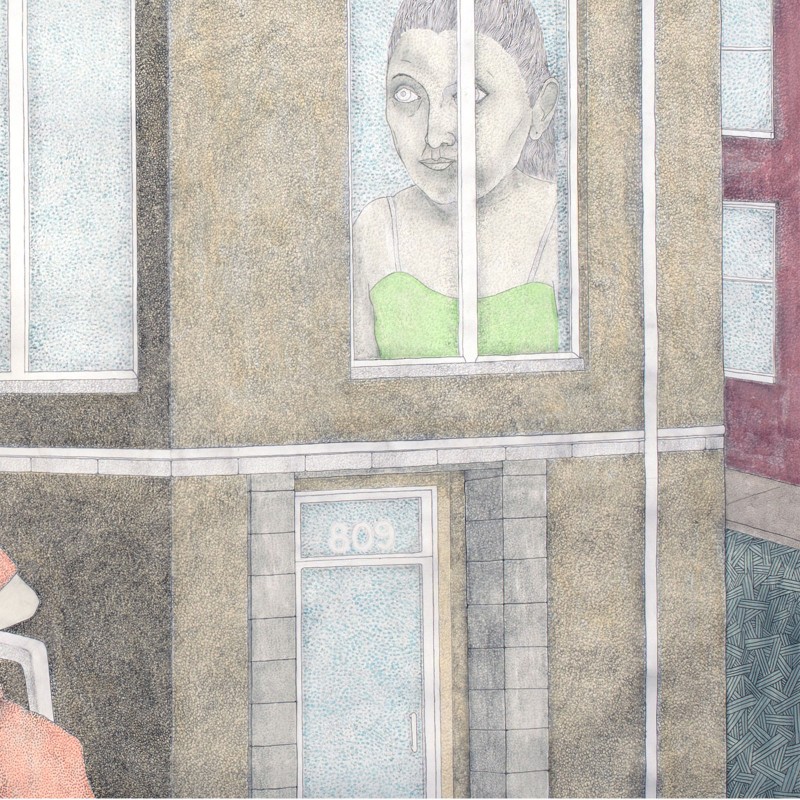 Ward’s “Shelter” is, I thought, the most provocative piece in the show. I’ve included an image with a separate detail shot of the piece. The architecture is so strange. Is it meant to be a parody of urban life? Look at the clothing: the woman’s housedress. Everything again is out of place and out of proportion. And what do you make of the two figures in the windows? Ward’s version of “lonely men in shirtsleeves, leaning out of windows”? I don’t know whether this is an urban landscape gone awry, or its psychological equivalent. Again Ward’s words: “I attempt to avoid establishing an evident narrative in the drawing, relying on a degree of ambiguity to lend it a sense of mystery, or an air of indeterminacy. It is this dynamic, or tension, between the evident and the unknown, the conscious and the unconscious, that informs my drawings.” This work is part Hopper and part Arshile Gorky (remember his “Self-Portrait with Mother”), with an overlay of Chris Ware. Imagine that if you can.