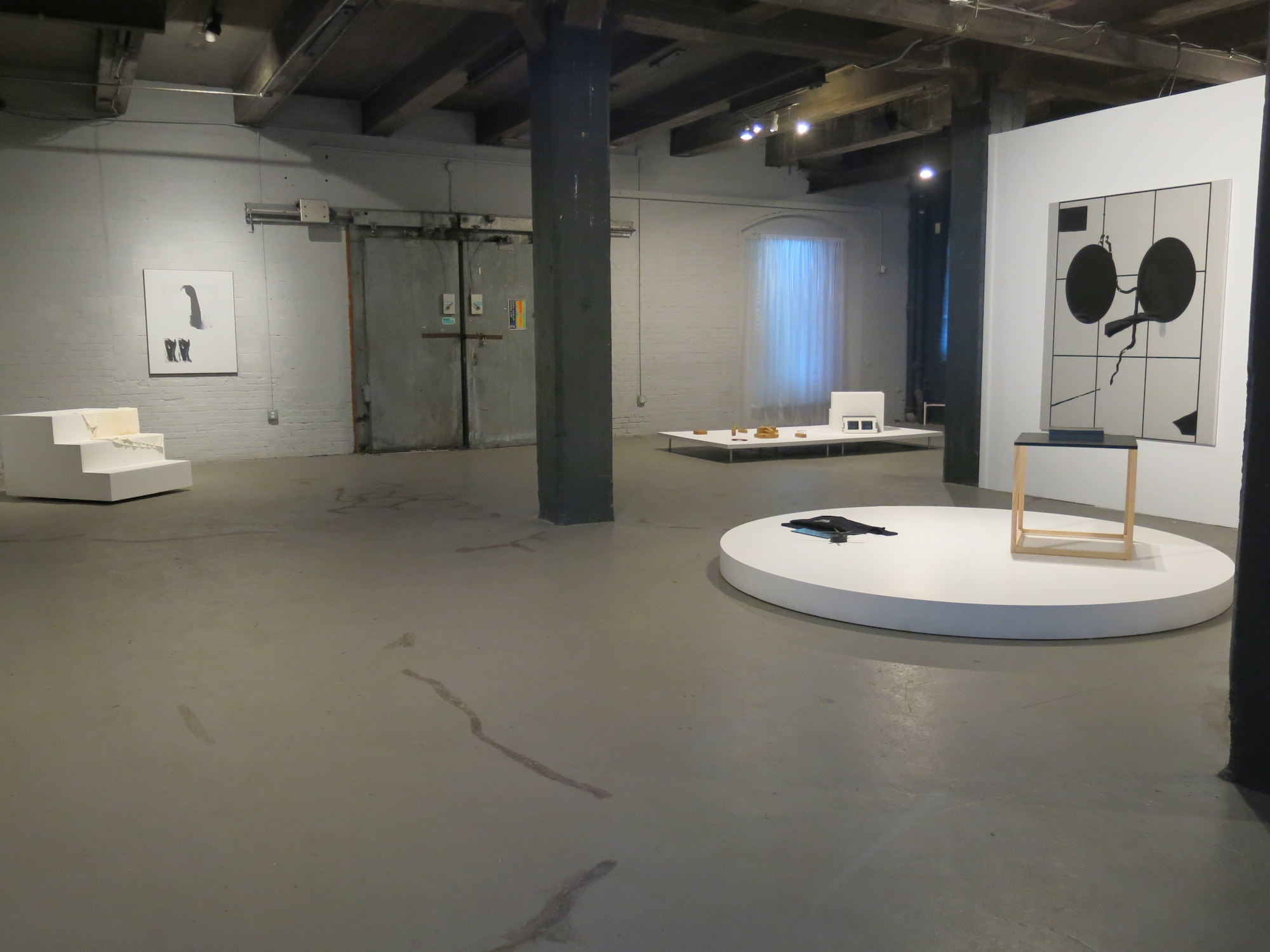 Moody and surreal, Chewing the Scenery is not as grandstanding and over-the-top emotional as its title would imply. That said, the exhibition of ten mostly under-known Philadelphia artists is tautly – and satisfyingly – theatrical. The “uncanny domestic” installation of a bright room within a darker space; stairs that go nowhere; curtains that flutter in no breeze; and dark mysterious objects dotting the walls and floor plinths imply a kind of forensic deconstruction of space, time and ideas. Imagine stumbling upon a film noir movie set, albeit here, there’s no plot. I kept thinking of David Lynch’s quirky darkness as I walked around the display.