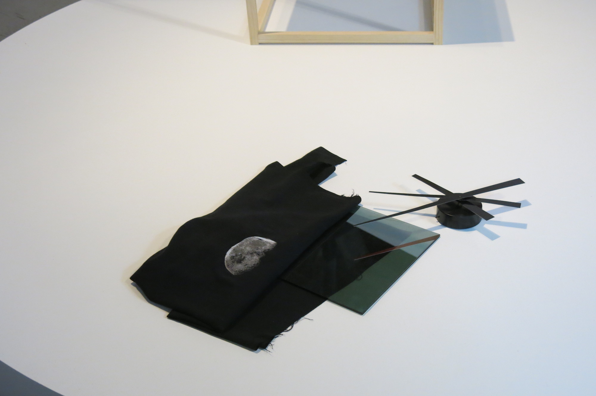 Situated at Crane Arts’ “Grey Space,” the antechamber to the Icebox, Chewing the Scenery pivots around the center staging of the bright-lit room where midnight-black objects shine like black holes. A modernist clock with no backing ticks the seconds in what seems a profound silence. “the past in the future tense,” by James Johnson, is a simple found-object assemblage, elegant and isolated, that speaks of lives lived, time lost, and a vast unstoppable universe of things, both man-made and natural.