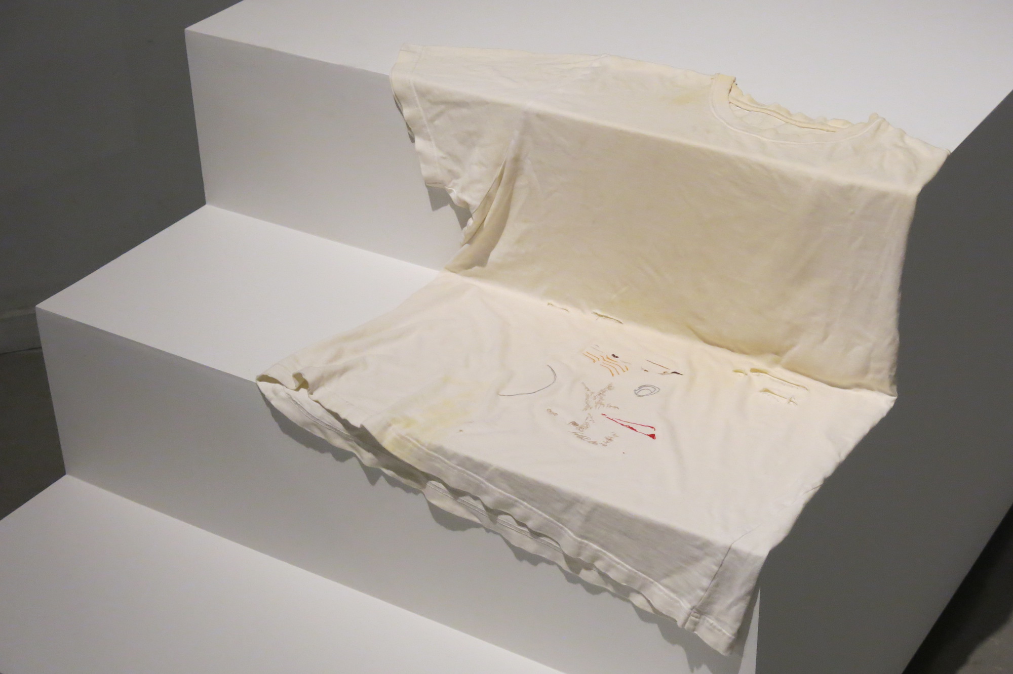 Johnson’s other piece nearby, “Borrowed Scenery,” a dirty white undershirt on which he embroidered some colored doodles, drapes itself to the contours of some stairs like a ghost trying and failing to become invisible. Many of the works in the show imply the human but with few exceptions no humans are imaged in the works, leaving your imagination free to roam where it will.