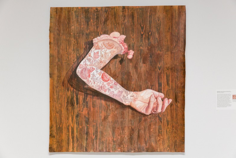 Organized in two halves, in the Lorenzo Homar Gallery’s front and back spaces, the first part of the show, “Reconstructing History,” seeks out the silences of history, giving voice to the intergenerational pain that stretches back to the earliest days of colonization. Báez’s acrylic and ink drawing “Retablo (España en las Americas)” sets the stage for this half of the exhibition. A white severed arm rests on a wooden surface, its fingers gently curled in a helpless gesture. The raw violence of the severed limb contrasts to the delicate tattoo, adapted from an 18th-century textile design, that covers the arm from wrist to shoulder. Báez’s unsettling tattooed arm points towards the racial, gendered, and political violence that continues to take its toll on the island.