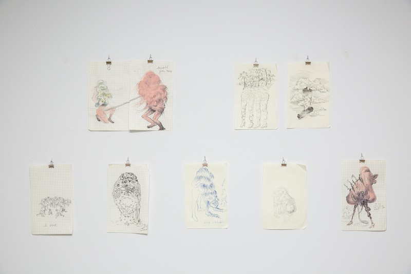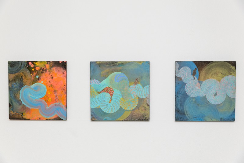Báez turns to the world of folklore and popular culture for her series of works featuring the ciguapa, a mythical female creature with backward-facing feet and a hair-covered body. A handful of studies offer fragments of the ciguapa and her story, which is explored in greater depth on the opposite wall. Báez’s “It’s Been Ours” is a comic book-like series of square painted wooden panels that hint at a larger narrative. In each panel, the small figure of a woman in silhouette capers through a surreal outer space-like landscape like a trickster Barbarella. In the final panel, we see the silhouette of a woman with a multicolored universe tattooed onto her skin, an optimistic contrast to the violently severed limb with which we began.
