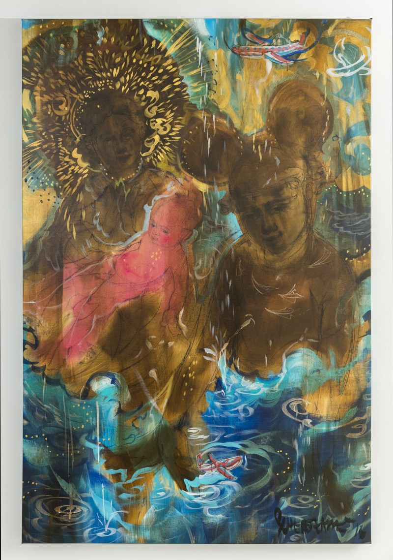 García’s monumental canvas, “Paradise According to the Tropics III/Sunburned Baby Jesus” offers a playful take on culture and commodity in our postmodern world. Inspired by the rich palette and dynamic, emotional figures of Baroque art, García’s angels literally look out of this world. One angel, holding the reddened body of the Christ child, looks up to the heavens, while the other angel’s downcast eyes and long, sweeping eyelashes almost distract the viewer from the incongruous Mickey Mouse ears atop his head. None of the figures seem to notice the falling rain or the rising water that surrounds them. Paper airplanes and plastic toy airplanes flit around the figures, suggesting one pragmatic way to escape this storm: emigration.