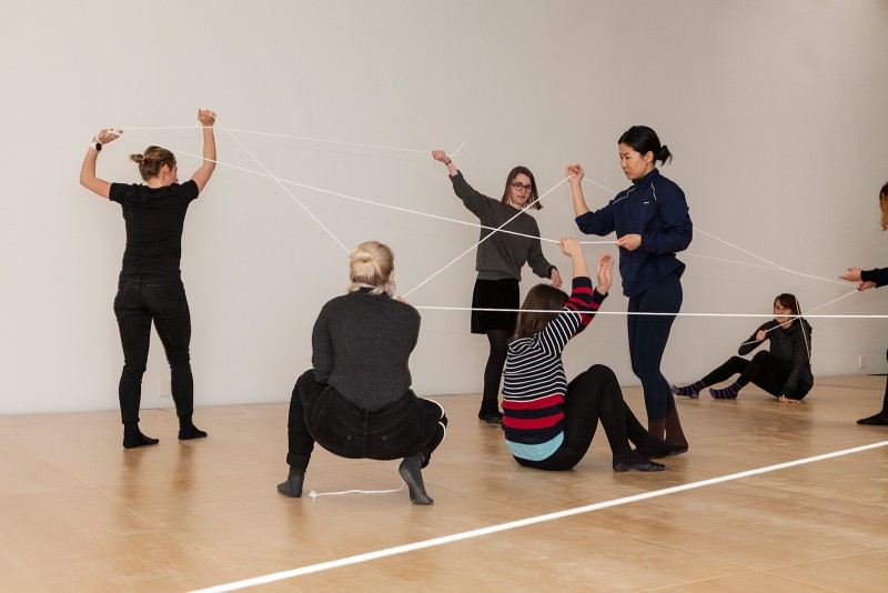 Led by Petronio’s directions—“Higher!”, “Lower!”, “Taut!”, “Loose!”, “Free play!”—the resulting kinetic web is simple its linear rope construction but complex in the power dynamics it explores. Petronio’s directions are ambiguous enough to remain open to personal interpretation, allowing one individual to respond differently from the next.