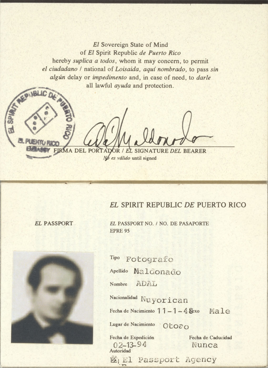 I saw Adál Maldonado’s works at Taller Puertorriqueño in 2004, and the mischievous conceptual sculpture, print and video pieces touched my funny bone and stabbed me with a pang of sorrow. In his “El Spirit Republic de Puerto Rico” (1994), included in Our America, Adál creates documentation, placed in glass vitrines, of a parallel universe in which Puerto Rican astronauts (Coconauts) are the first to reach outer space and passports have I.D. photos that are a complete blur, since blurriness is the state of being Puerto Rican in America, according to the artist.