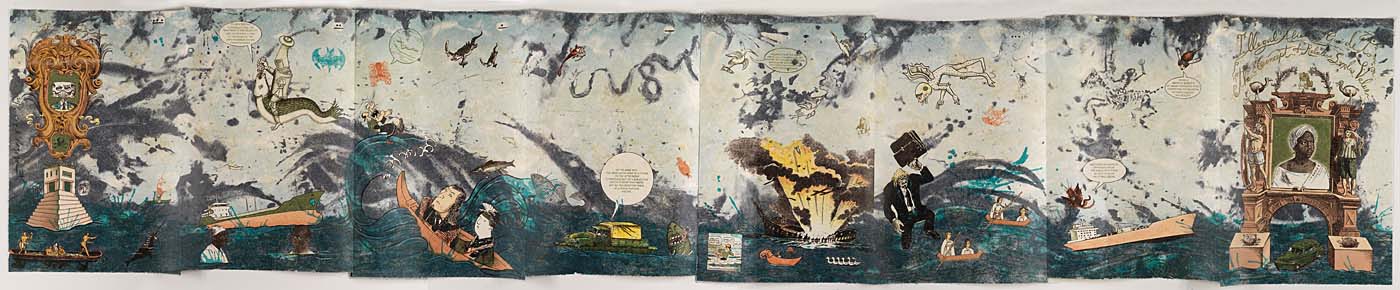 It’s the opposite of erasure in Enrique Chagoya’s financial history scroll print, “Illegal Alien’s Guide to the Concept of Relative Surplus Value” (2009). Set out flat in a vitrine, the 15” x 80” lithograph reads like a visual narrative of the financial universe ala Monty Python’s sketch comedy hour. A sea-faring narrative bracketed by a Mayan temple on the left and an altar to a slave on the right, the scroll brings art history, history, pop culture and Karl Marx together to savage the world financial meltdown in 2008. Olive Oyl yells to Popeye for help; an oil tanker spews oil blackening the sea; a Hokusai wave threatens a rowboat, dragons and fish fly, bomb-carrying storks explode the ships below, and throughout, thought bubbles quote Karl Marx – “Nothing can have an intrinsic value. The value of a thing is just as much as it will bring,” says a dragon. It’s a rollicking piece and deserves to be studied.