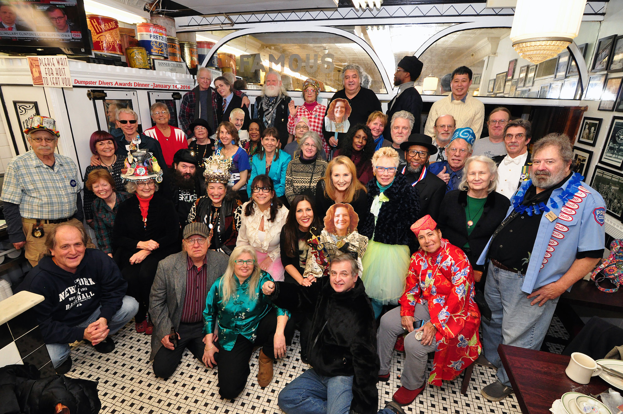 Jim Ulrich – Note that this is the 2016 group photo from the Dumpster Divers’ Annual Awards Banquet held every year at the Famous Deli. It is never a photo of all the Divers, just those who make any given year’s “banquet”. (One staple of this annual event is the annual “Golden Hanger” award for best outfits, one male, one female. I actually won the mens division this year. That’s me far right 3 rows back in the short waisted military style dinner jacket with medals made from found materials and duct tape, shoulder boards made from smoked oyster tins, and nut and bolt cuff links and shirt studs.)Artblog – If you can send me a little blurb about the group…