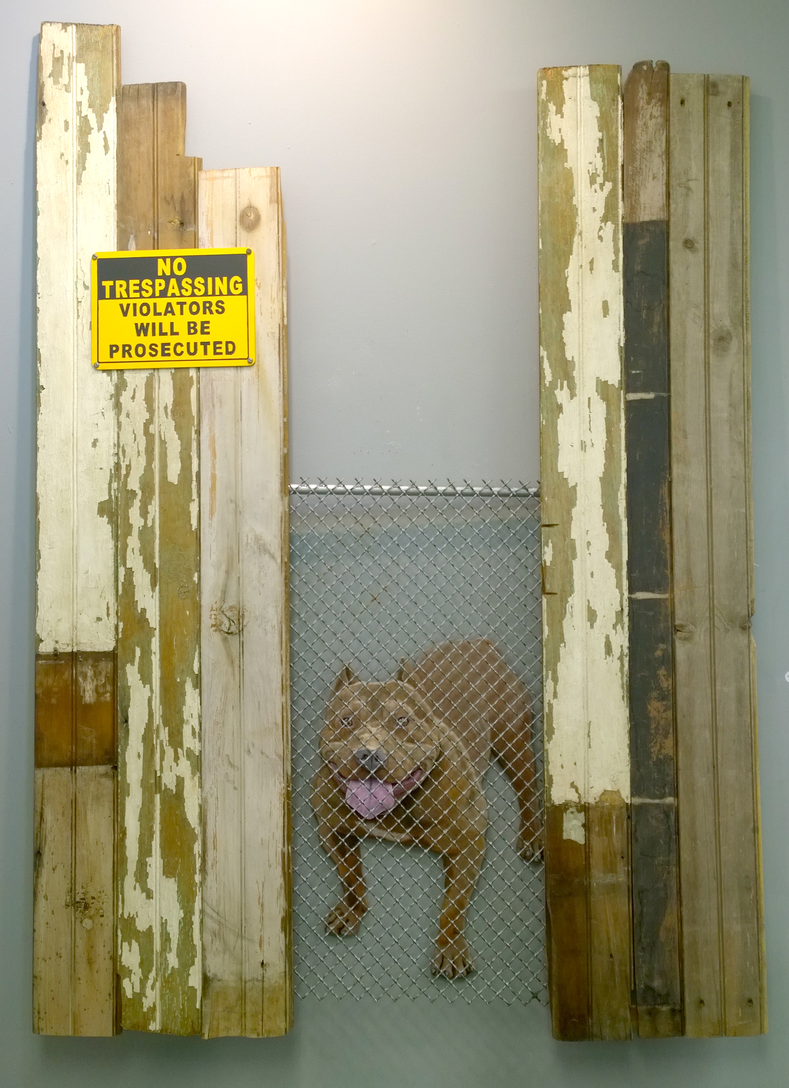 Jim Ulrich – Nearly all of my own art work incorporates found material in some fashion; that’s typically what I rely on to spawn ideas. But I often have to fabricate other elements in order to flesh out whatever ideas might be generated by stuff I’ve found, using whatever materials seem to be called for to get the job done. (In the past I’ve also worked with various printmaking media, photography, ceramics, welded steel and varied mixed media.) Examples of much of my own work can be viewed at http://www.jim.ulrich.com. Illustration website: www.jim.ulrich.com/illustrationLately, I’ve been working to incorporate a greater portion of hand-made content under the theory that the average viewer is more appreciative of work created using more traditional art-making methods than they are of compositions created solely from re-purposed materials. I’ve attached an image of my very latest, a piece called “The Prosecutor”. It’s being exhibited at the current Divers show in Media. While the “fencing” is all found material, the dog was fabricated from sevral layers of scroll-cut plywood and a paper mache tongue, then painted with artist’s acrylics.