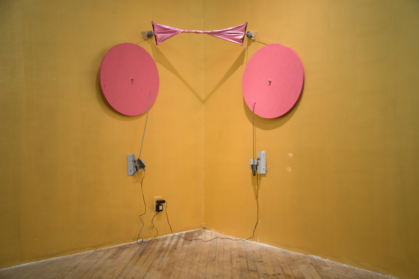 In the space labelled PLAYDATE #1, Lucia Alber’s use of baby pink silk, elastic white vinyl, and billowing satin is seductive. I always find myself tempted to touch Alber’s pieces–gold and pink satin sewn taut over plush pillow forms invites me to run my fingers over it. It is impossible not to contemplate my own concepts of the physical, political, and personal body when viewing her work. In PLAYDATE #1 the work of Katie Rauth comes into the conversation. Jerking and relentless motions of Rauth’s “Better Work,” a motorized fabric-twisting sculpture, and the video installation “Sick’ning” similarly reference the body and its mechanics. The body’s connection to our humanity and identity, and the particular pressures put on women to “present feminine” underlies the pairing of these two artists.