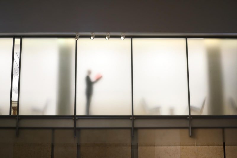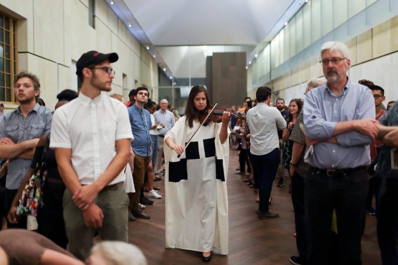 Musicians of the Prometheus Ensemble, dressed in long robes decorated with black and white geometric shapes (designed by Rocio Rodríguez Salceda), stood at the back of the atrium, while at the other end by the entrance was a large stage. Although empty to begin with, the stage gradually filled with luminaries like traditional Ethiopian musician Gezachew Habtemarium, pianist Emily Manzo, banjo player Ben Lee (known as Baby Copperhead), and guitarist Arnold de Boer from the legendary Dutch post-punk band The Ex (known for their collaboration with traditional Ethiopian musicians). After brief introductory remarks from Tusman and Clayton, performer Eric Rath appeared in the upper story offices, silhouetted against frosted glass, and began to recite the maker, title, and medium of the works of art in room 21 of the museum. This repetitive, almost incantation-like text acted as a leitmotif throughout the performance, tying together the musical compositions and connecting them to objects in the collection.
