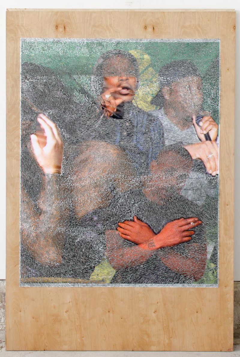A trio of plywood panels bookend the exhibition. Propped casually against the wall, they bristle with thousands of heavy-duty staples, punched through the surface of the wood. Underneath, it’s possible to make out colorful posters, like those found along city streets advertising upcoming events or concerts. The product of hours upon hours of meticulous and physically taxing work, Wilson’s panels are meditative exercises as much for the viewer as the artist. Studying them, the staples became less of an opaque, impenetrable, and angry surface, and more a series of subtle patterns that engage with the imagery on the posters beneath them. Gentle curving waves of staples give way to rigidly vertical staples over the heads of figures, and sections of the posters remain free from staples–gesturing hands, an open mouth, a lifted microphone all hint at speech and silence. Like Adkins, Wilmer explores the power of speech and language, asking whose voices are silenced, and whose voices are heard.