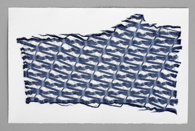 Similar in their exploration of African and African-American history are the works by Sean Riley, who uses indigo, a natural dye with a rich blue color. Long cultivated in West Africa, indigo became a successful cash crop in the southern United States thanks to slave labor. Riley invokes this history in two textile works made from inherited fragments of denim in which the artist has pulled apart the horizontal weft threads, as if picking apart a tangled family history. The deconstructed denim fragments look like plant cells seen under a microscope, or flattened strands of DNA. The powerful materiality of these pieces evokes history that is both collective and deeply individual.