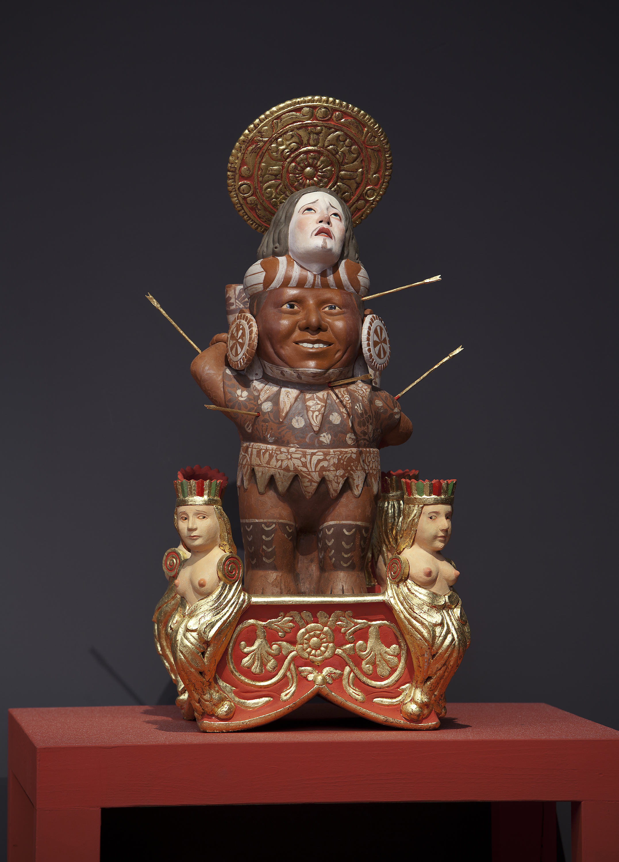 Terracotta, underglazes, casein paint, gold leaf, wood