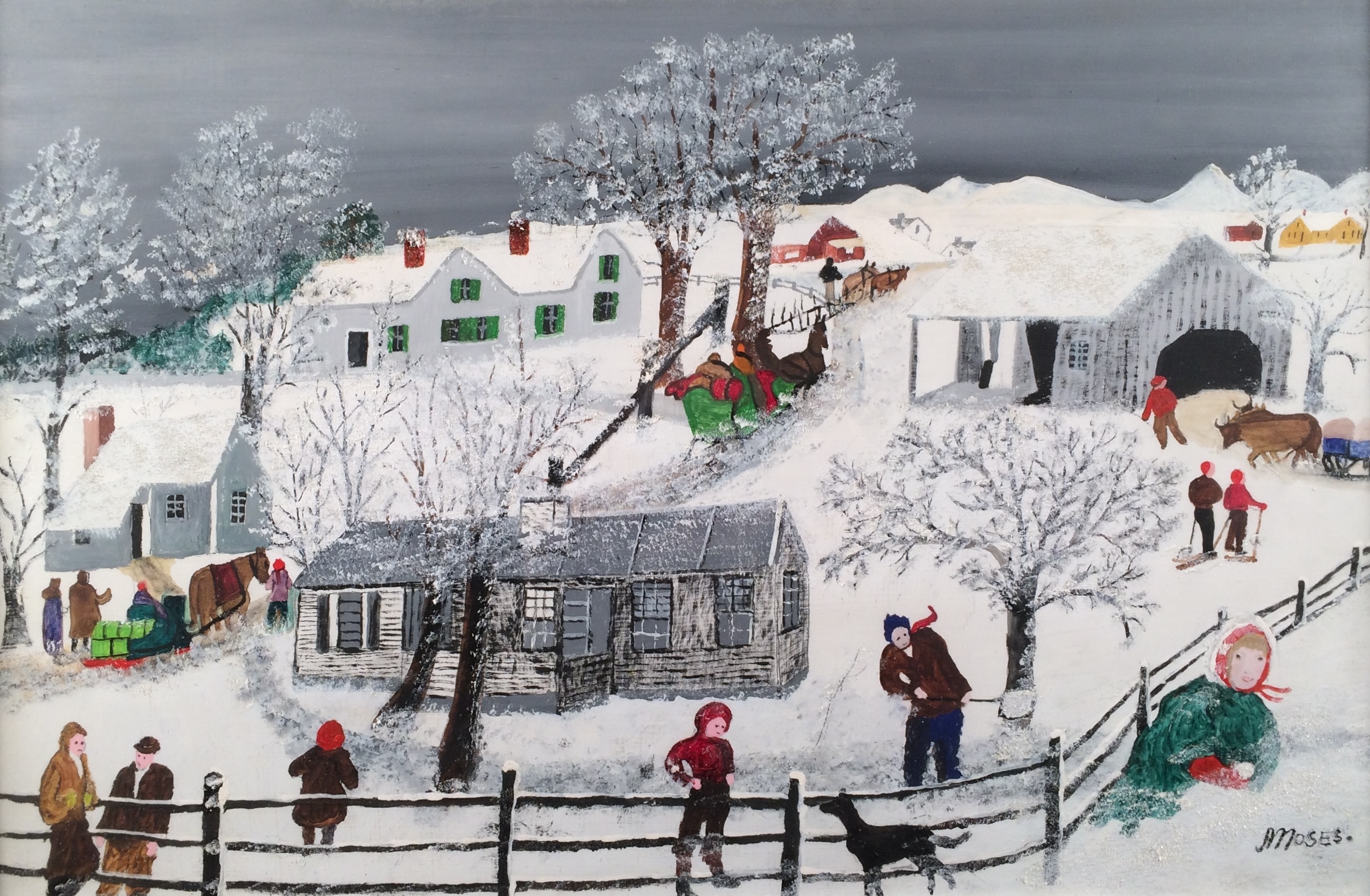 Moses, who had painted scenes on various objects in her home, was in her 70s when she first began to make pictures with embroidered yarn. When her hands were too stiff to hold a needle, she began painting in oils. In 1938, collector Louis Caldor saw her work in the window at a drugstore that was part of the local Woman’s Exchange. He brought her works to New York City and they were soon being displayed in museums, galleries, and department store exhibitions.