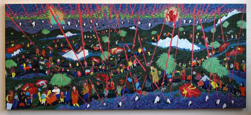 Haley Hughes’ arresting painting “Climate Refugees NYC” is the first piece to grab the eye upon entering the gallery. Her work is the most strictly visual component in the overarching activism of Resistance After Nature, but is a powerful signifier of the stability that a cared-for environment provides and the transience of one in crisis. The pseudo-apocalyptic scene reminds us that we have no home but the one we inhabit, and that self-made climate catastrophe renders us all homeless.