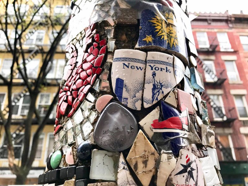 If New York is anything, it is a junkyard of broken dreams, broken hearts and lots of broken pots. Few surfaces are free of declarations of love or hurt, or the cobbled efforts of communities to decorate their environs with the souvenirs and effluvia of their lives. This telephone pole became such a home for a mosaic on an East Village street. The folk art totem announces that everything is sacred or at the very least interesting; it is a greeting and a welcome into the amalgam of the City’s many worlds.