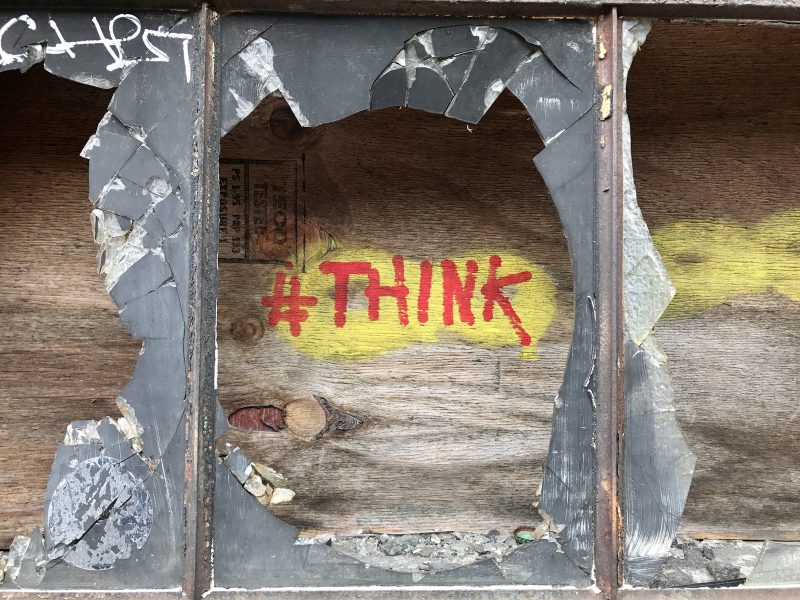 Perhaps the most obvious creature of a large city like New York is decay. Broken windows, abandoned cars, lost shoes dot the landscape like an endless outbreak of the measles. #THINK is more an internet message perfectly placed and framed: The capture is a comment pressed into an abyss: An abandoned home’s boarded up window, itself broken and painted over. But the red on yellow hashtag is a sign, a semiotic fragment oozing out of the linguistic swamp of images and text and context. At the same time it’s not just a critique of the cause, but also, ironically, a symptom.