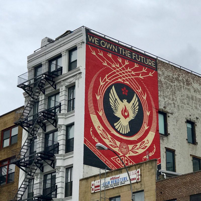 Fewer artists have ascended the street cred art world like Shepard Fairey. An heir to Jean-Michel Basquiat, contemporary of Ron English and Banksy, his Russian, graphic-inspired “OBEY” art works have long been featured as paste ups and highly sought-after collectibles. This piece, a militant billboard on the side of a SoHo apartment building offers a challenging vision of Hope. “We Own The Future” echoes an Orwellian dystopia, an optimism mired in misdirected sloganeering like Trump’s “Make America Great Again.” Fairey is pulling our leg.