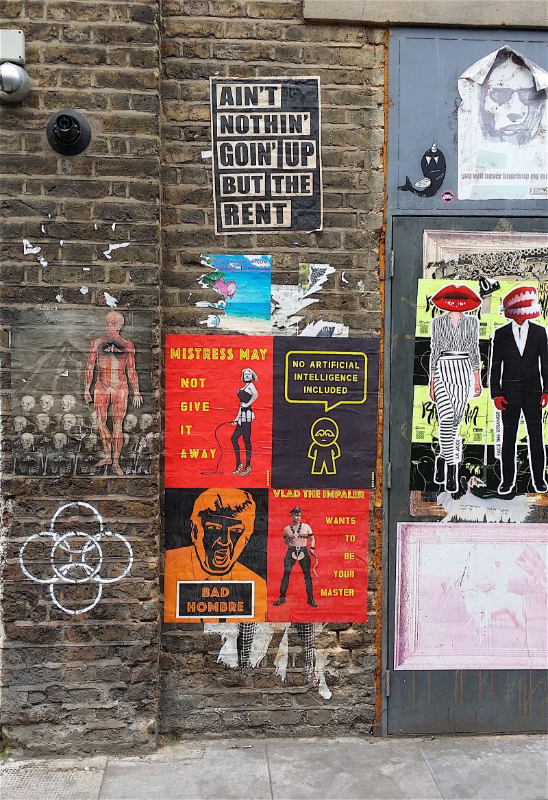 Unattended walls in large cities often end up becoming community bulletin-board rant-zones. Messages are smothered, one on top of the other and often complaining with graphic intensity about any number of issues. A poster on Brick Lane, East London blares out “AIN’T NOTHING GOING UP BUT THE RENT” and shares visual company with a bitch about UK Prime Minister “Mistress May” and “Bad Hombre” Trump, along with a work on Vladimir Putin and the useful admonition: “No Artificial Intelligence Included.”