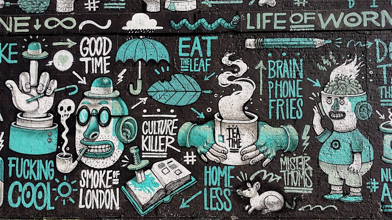 What we all love about street art is that it never goes to sleep, and over time, day and night, radiates a range of meanings. This work (only a detail) occupies an entire wall, perhaps more than 200 feet long and 10 feet high. The compression of text and image by “Mister Thoms” is stunning, and the coding of the artist’s running commentary on books, Londoners, the rain, tea, iPhones and slapdash culture is a poetic open book of dated aphorisms, jokes, comments and cartoons. He offers the finger to those with their hats and canes, but still likes them enough to share a laugh about the way things were. Mister Thoms’ mural reads like a contemporary hieroglyphic filtered through a London of the 1960s. The mural, MJ notes, has since been blacked out and another has replaced it. Location: Great Eastern Street, Shoreditch, London.