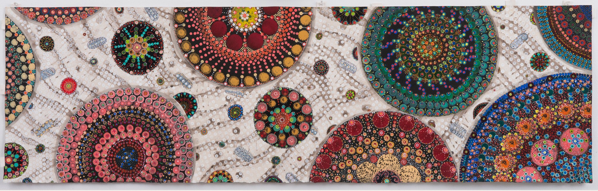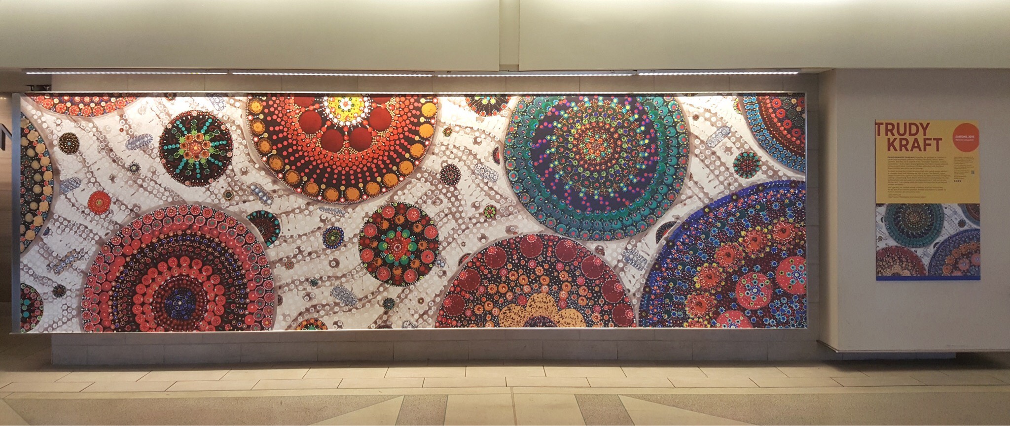 More great art at the PHL Airport, summer travelers! See Artblog favorite Trudy Kraft’s mesmerizing “Diatoms,” in Terminal C (ticketed passengers). If you’re traveling and in Terminal C be sure to stop by her installation at Gate 28. Kraft’s works on paper are made by a meditative and laborious process of adding and subtracting color and design. Here’s the Trudy Kraft page at PHL for more information and/or check out the artist’s website. More general information about Art at the Airport, started in 1998 and 300 exhibitions strong to date. Leah Douglas is the fantastic curator of this Philly-centric art program. Bravo to Leah!