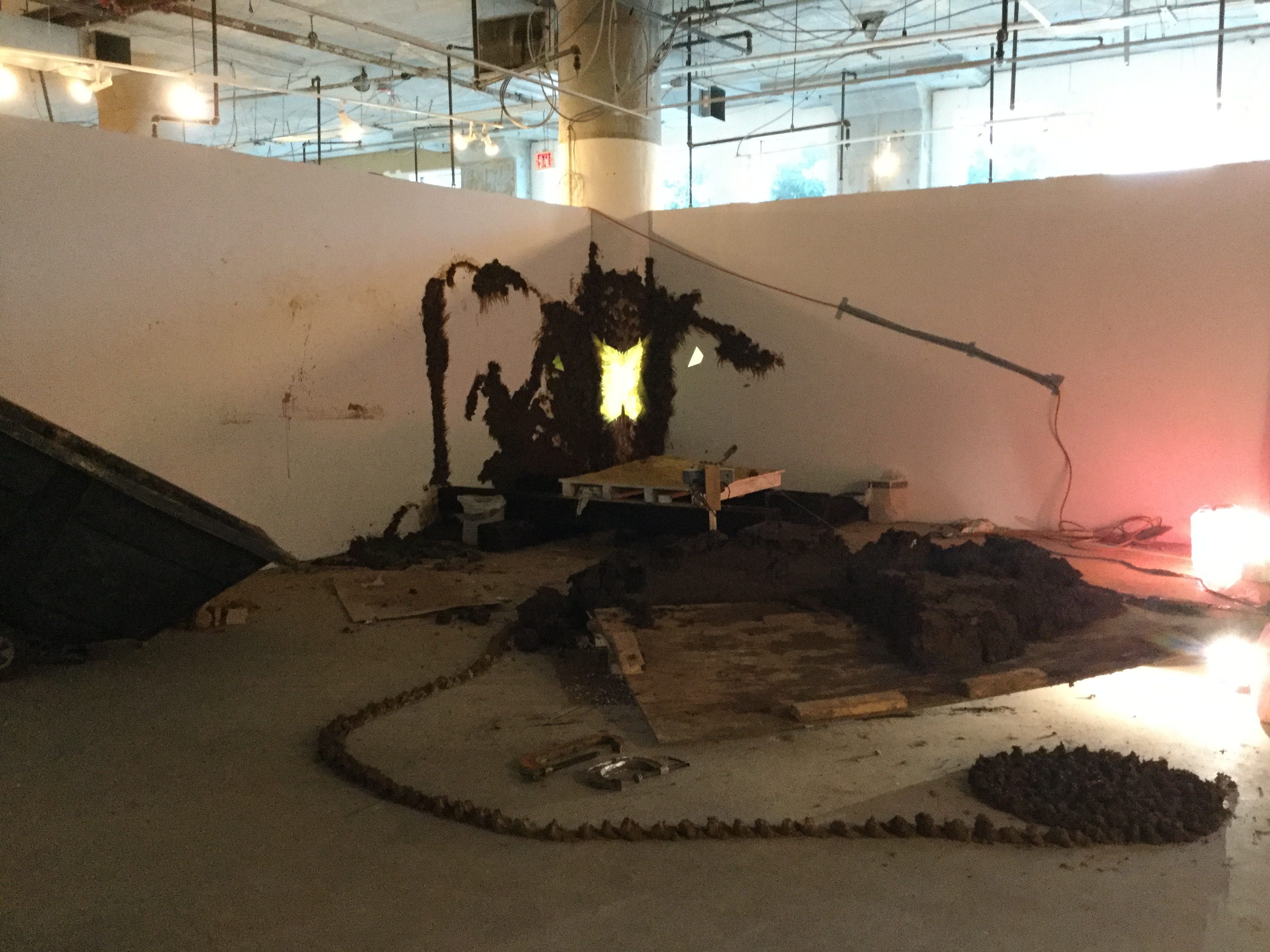 I visited 990 Spring Garden Street on July 14, 2017, for the openings of the alternative galleries driven out of their home at 319 N. 11th St. Vox Populi, Napoleon, Practice, Marginal Utility all have exhibitions to Aug. 20 with another First Friday opening, Aug. 4, 6PM – 10PM. The galleries are in the first floor in spaces that are large, open, and filled with windows. In the case of the Vox Annual Juried Show, Are ‘Friends’ Electric, the large, high-ceilingsedspace with partition walls mostly did not create an intimate space for works that would benefit from close quarters. However, Souleye Fall’s sprawling, basement-like, mud-splashed installation “Beneath Lies the Future of Our People,” 2017, looked right at home. I love the brut, ritualistic anti-ambiance of the installation and am sorry I missed Souleye Fall’s performance. Listen to the 2016 podcast I did with the artist in which the Senegalese-born artist talks about his hand-sewing practice.