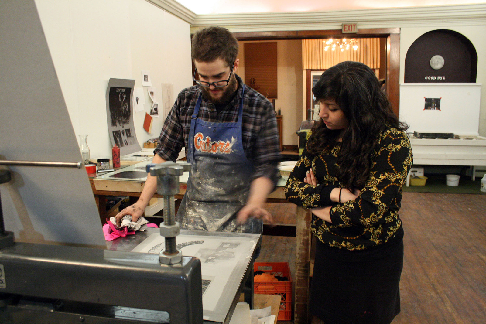 Liz: I had recently finished my BFA at School of the Art Institute of Chicago, was working at Spudnik Press as a studio monitor and screen printing tech, and had interned at Chicago Printmakers Collaborative. I had more experience with community shops, in contrast with Gabe’s experience at print shops that focus on publishing. To this day, I specialize in screen printing and relief, and do more teaching. Gabe is our resident lithographer and etching expert, and heads up publishing, although our roles often overlap.