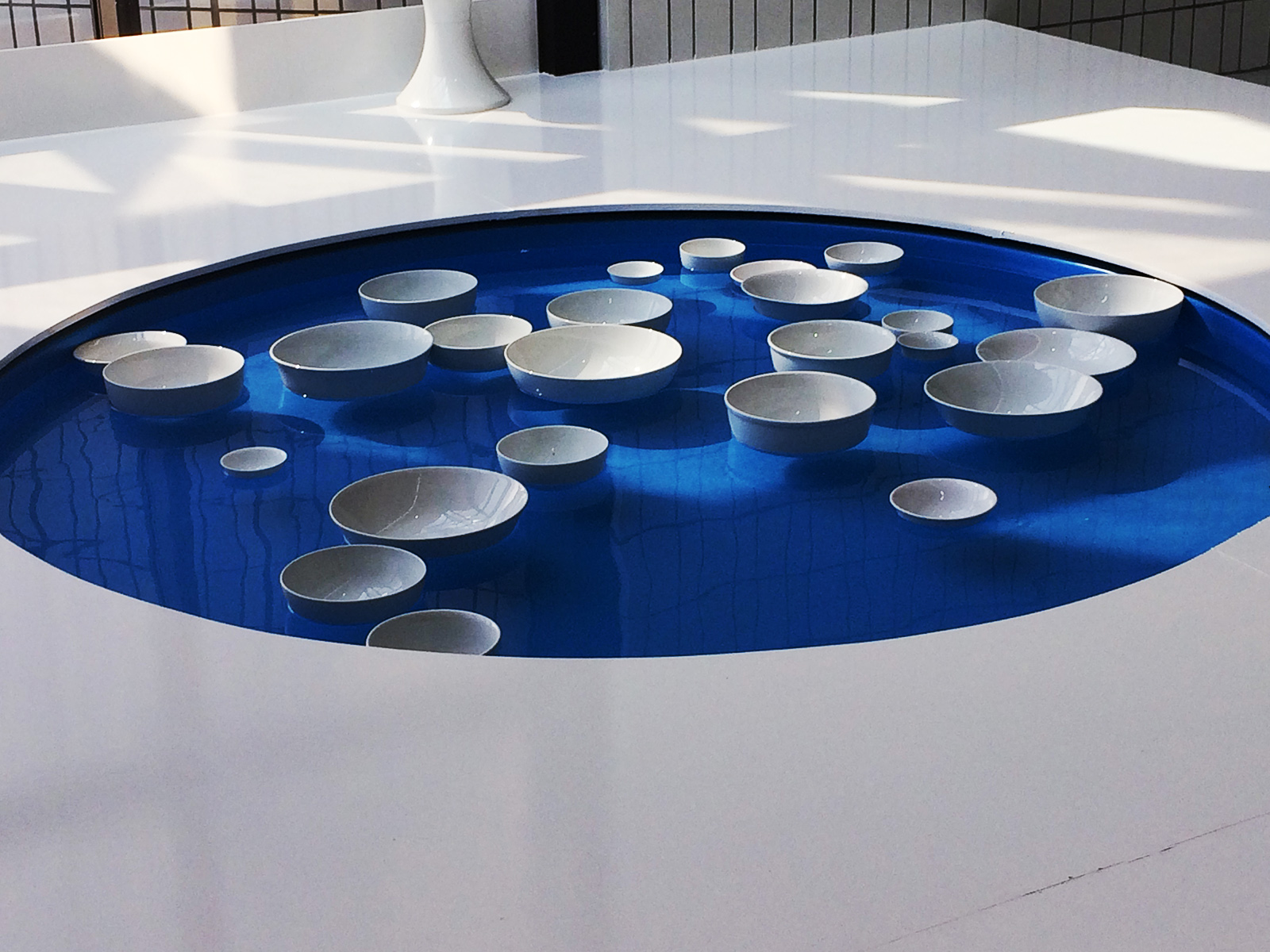 “Musique à Voire” included a range of important artists with Marcel Duchamp, John Cage (a work in homage to Duchamp), Jean Tinguely, and Nam June Paik among them. It also included two very different works by an artist, Céleste Boursier-Mougenot, whom I didn’t know (although he had a solo exhibition at the University Museum of Contemporary Art, UMass, Amherst in 2012) both of which were notable and immensely engaging. The first was a circular pond in which floated a number of white, porcelain bowls which made the most wonderful, chime-like sounds when they touched each other.