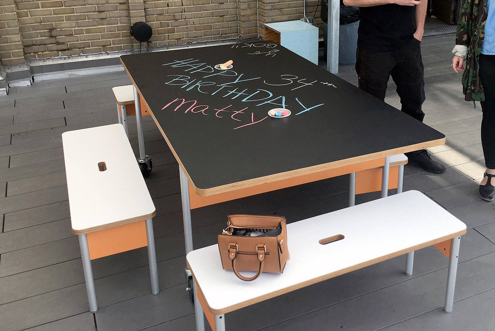 Milder Office is both a company and a system for designing furniture that focuses on the end user. While Milder typically designs customizable furniture learning and working environments, they stepped “out of [their] typical language” to create furniture for Bok Bar. During the design process, Avigail Milder shared that “we envision these tables to be an island of calm, a communal space that brings people of diverse backgrounds together – like our company, which is influenced by Israeli, German, and American heritage”. Milder Office successfully combined work and play in their communal chalk board tables, which come equipped with a chalk holder for doodling and drinking.