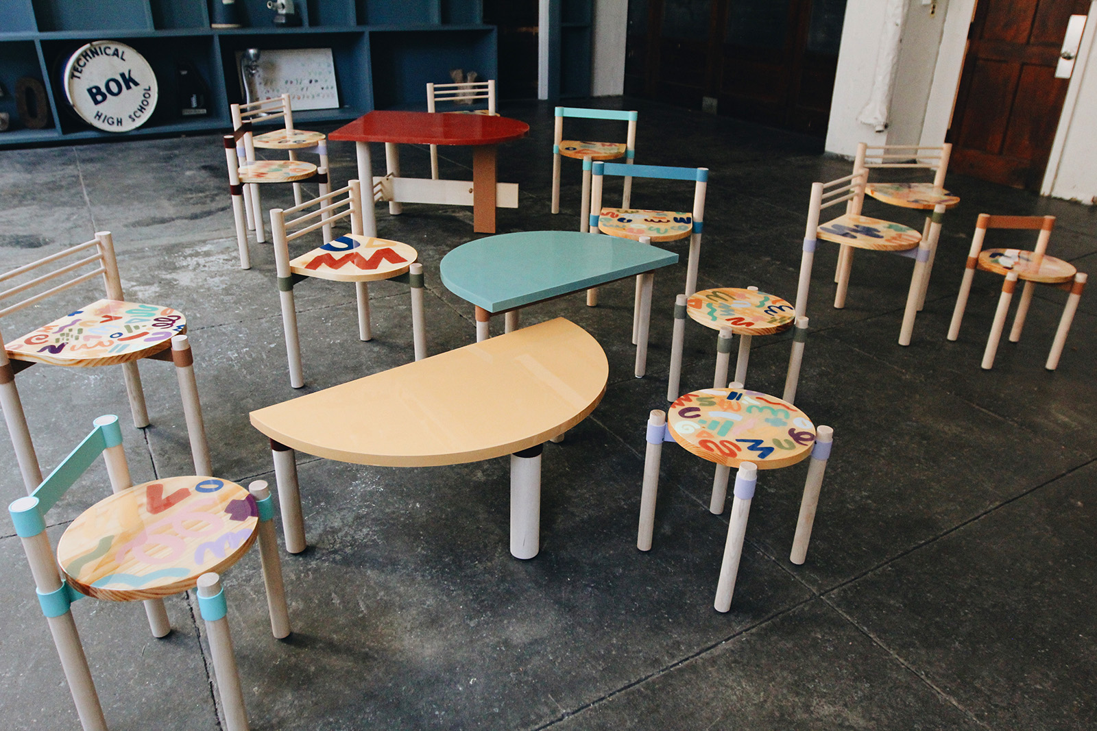 This past February, Bok Bar commissioned eight local individuals and small teams of designers, makers, and artists to create bespoke furniture for Bok Bar. The teams that were chosen are diverse – from emerging visual artists to long-time Philly furniture designers. For 3 short months, the teams went through a concept design process lead by Scout’s in-house architects, Emma Rutherford, and Richard Hall, and co-founder/managing partner, Lindsey Scannapieco.