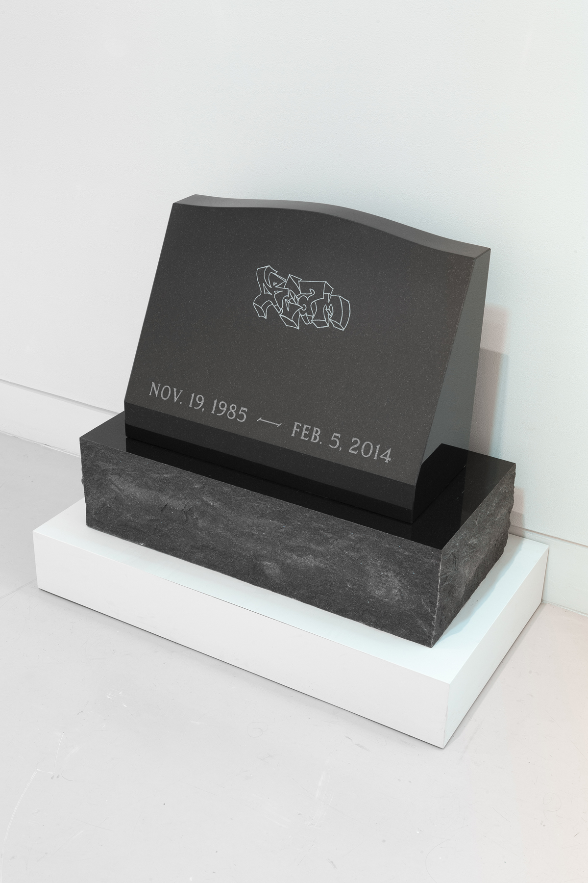 Behind the partition wall the tone is elegiac. There is an actual polished granite grave marker, “Alternative Marker,” with a grafitti tag engraved in place of a name and birth and death dates (1985-2014). Someone died tragically young. The marker will be moved to a meditation garden, we are told. It’s hard to be chipper when faced with the news communicated by this beautiful object. Other works beyond the partition evoke a ghost and a monster screaming. And then there’s the pale pink graphite-on-wall work, whose mantra-like splay of words is, like the audio piece “Blah/me,” a monolog coming at you. Only this one is personal, all about you. “You would not say that to me if I were not, I would not say that to you if you were not,…” and so it goes, an accusation that might just end a conversation while meaning to start one.