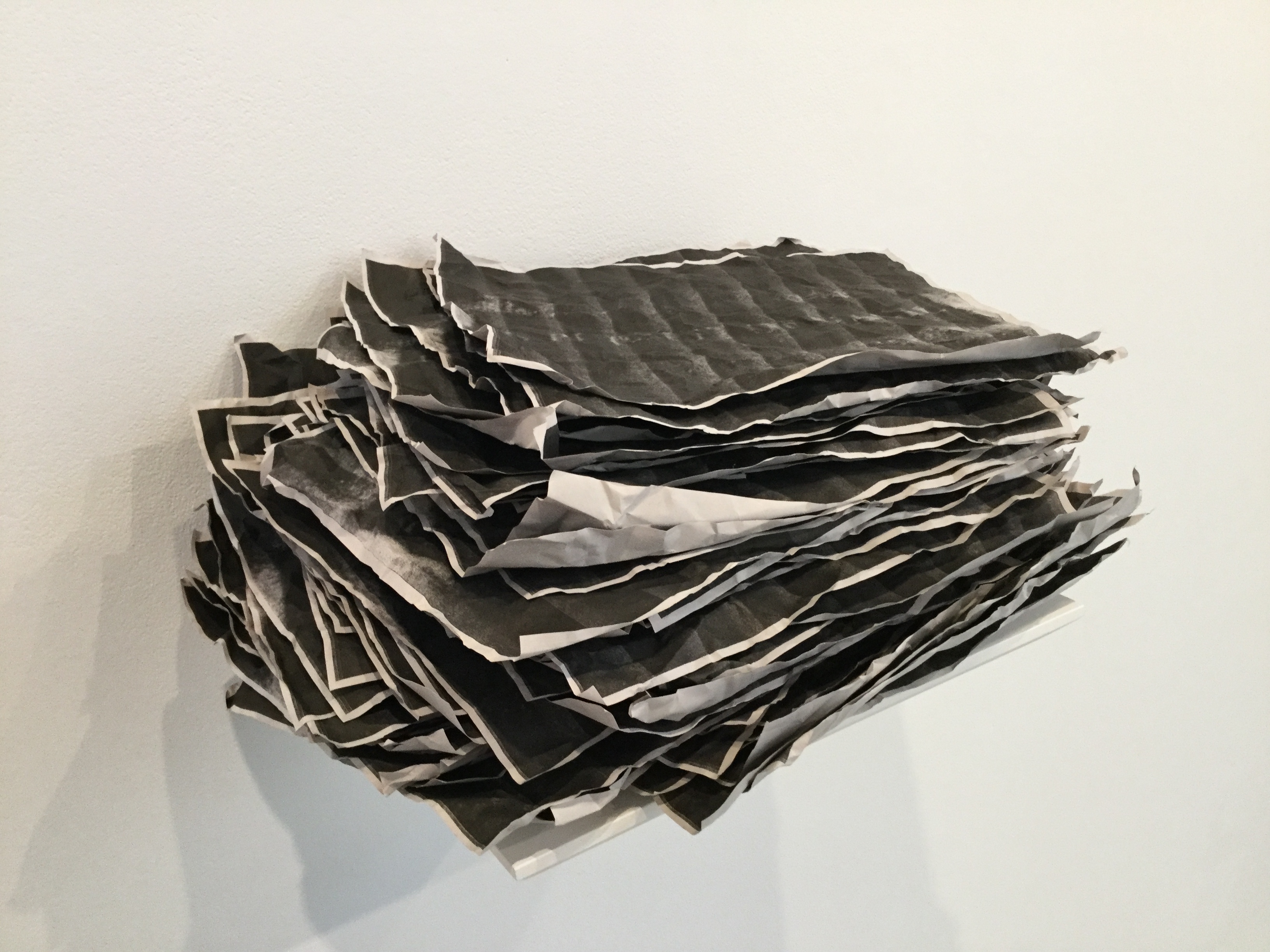 There are two take-away pieces. Are you going to take them? Do you want them? What will you do with them? Are they art? This is a conversation you can have when walking up to the shelf with the pile of shiny green buttons that say “You kill it, you eat it.” Or, when walking towards the stack of crumpled and uncrumpled photocopies called “In Pursuit of Magic,” which hovers (not magically but looks like it from afar) above the floor midway in the room, you will ask yourself: Do I want this? What is it? What do I do with it? While I did not take the button, I did take the crumpled dark paper, crumpled by the artist, uncrumpled by the artist, which spoke to me of the lifelong cycles of birth/death/renewal and anger/frustration/redemption. It called to me and I grabbed it. Although, really, I want the whole pile.