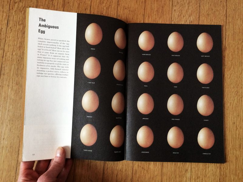 I am looking at issue No. 7, “The Egg”; It is printed on matte paper and is a comfortable size to hold in the hands. In 50 pages it addresses subjects from the inscrutability of eggs, that do not reveal their condition visually, and practical topics such as the ideal way to crack an egg and how to place one on a surface so that it will not roll off, to appreciations of the sensual experience of choosing eggs individually rather than buying them in a carton. This small publication encourages readers to slow down, to pay attention. It is more poetry than prose, and is unlikely to be appreciated by someone whose knowledge comes entirely from a computer screen or anyone who needs crowds and loud music to have a good time.