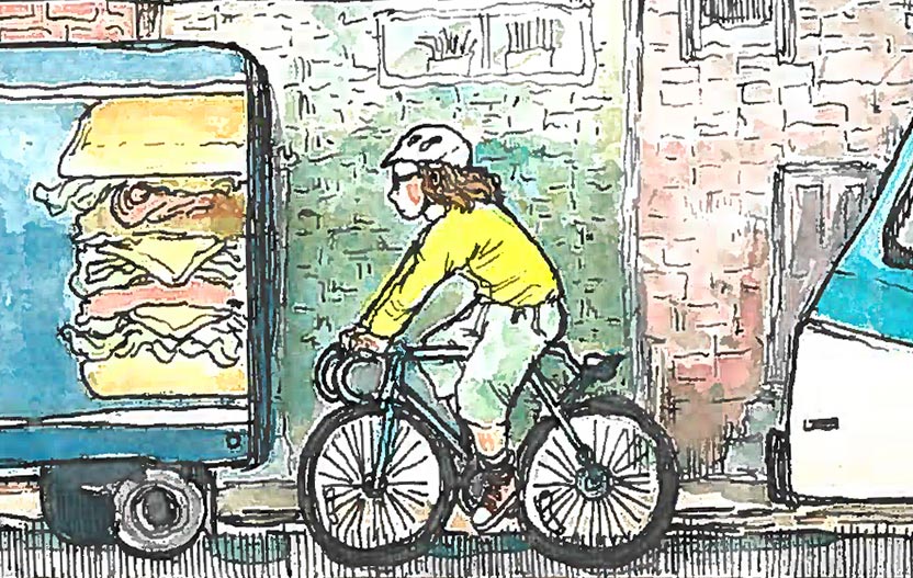 I was having tea with friends at the Good Karma Cafe one evening, when, as luck would have it, I glanced to my right and noticed Oli Knowles carefully hand-coloring a newly drawn page in a thick notebook of comic illustrations. Even from a distance, the work had this delightful, jewel-like quality, so I butted right in and asked if I could have a closer look. Oli was gracious enough to share their work with me, and I was every bit as impressed with its clear point of view as I was its aesthetic strength. Several weeks later, we’re thrilled to announce Oli Knowles as Artblog’s newest comics contributor, and proud to premier the world of “Socialist Grocery” on our site. We hope this will be the first visit of many!