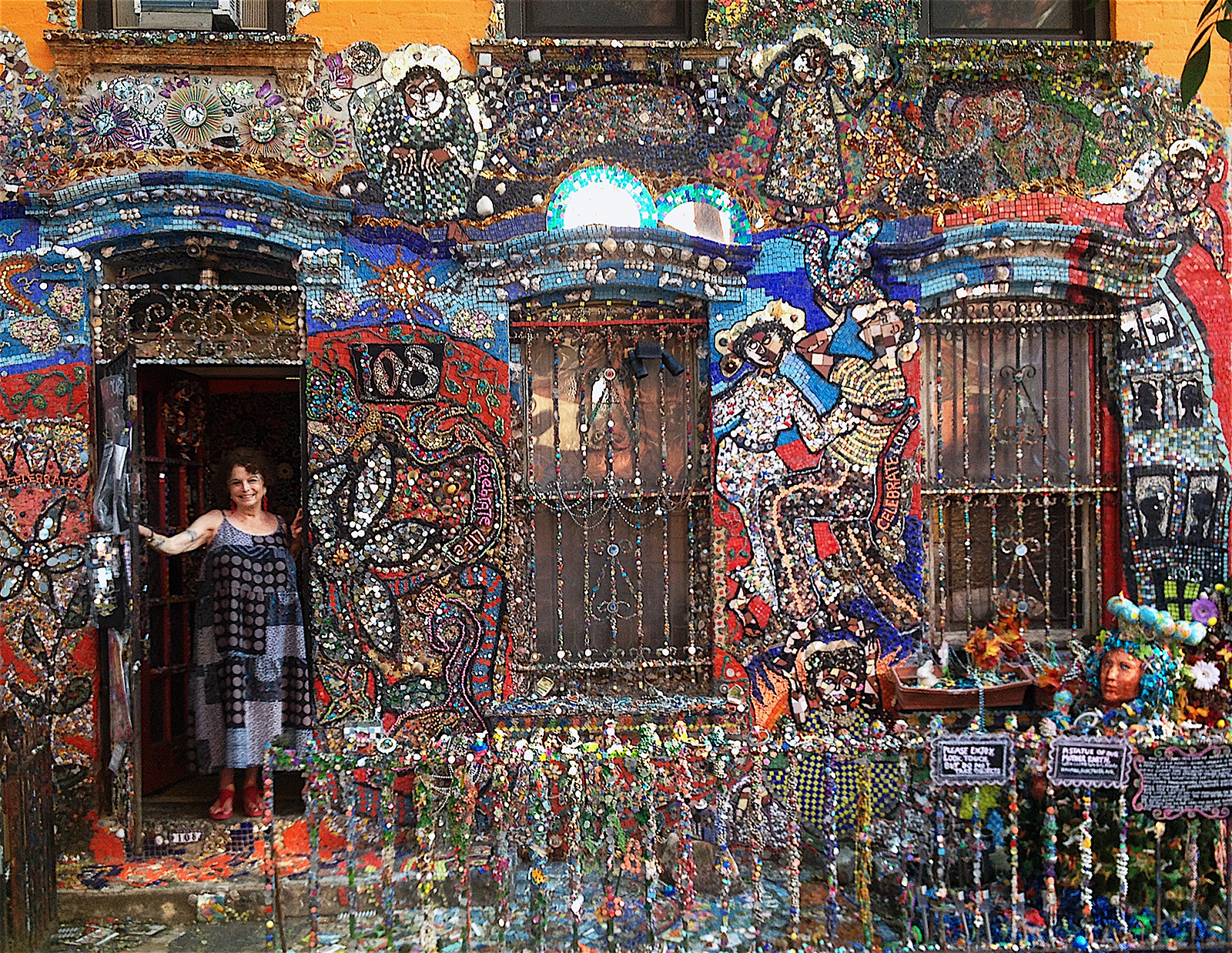 While many people reference Howard Finster’s Paradise Garden in Summerville, Georgia, as a model for Gardner’s Mosaic House, it doesn’t quite aim at the same sociological space said the artist. Gardner doesn’t have Finster’s obsessive religiosity nor do her texts contain the overt Christian adages Finster thought to be inspirational. But Gardner joked that she does share Finster’s “outsider artist” status. [Ed. Note: Philadelphia’s obsessive mosaic maker, Isaiah Zagar’s “Magic Gardens,” while not religious in intent, have the effect of inspiring and comforting people.]