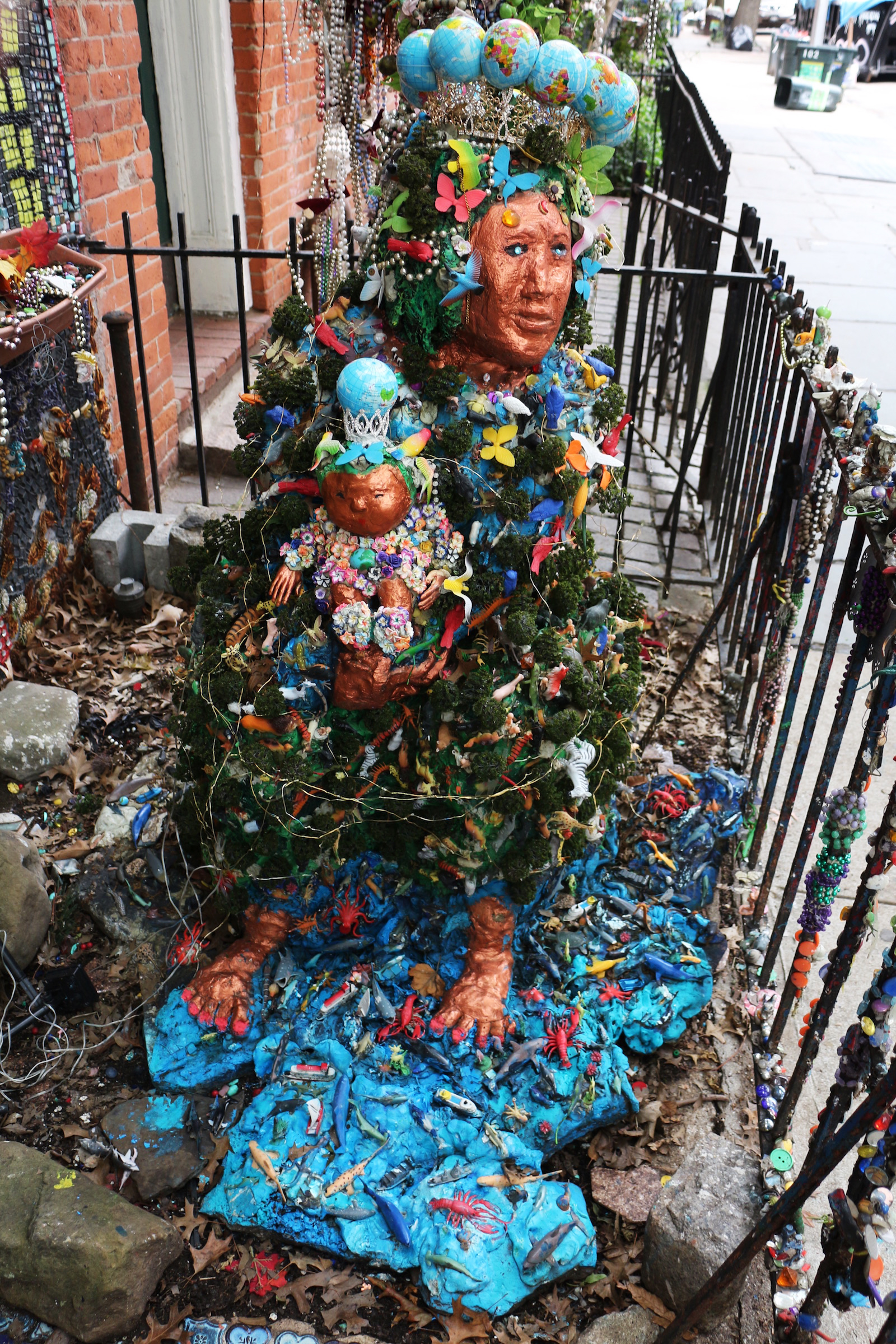 The figure, seated on a green throne, sports a crown of globes and cradles a child; plastic toy fish swim about her feet in a pool of blue-colored cement. “It’s a way to talk to the kids,” she said. “See, she holds a baby… that’s Baby Earth – that’s you. You better take good care of your mother!” Then she added, “As a mother and former professor, I can tell you, we’re in deep shit.”