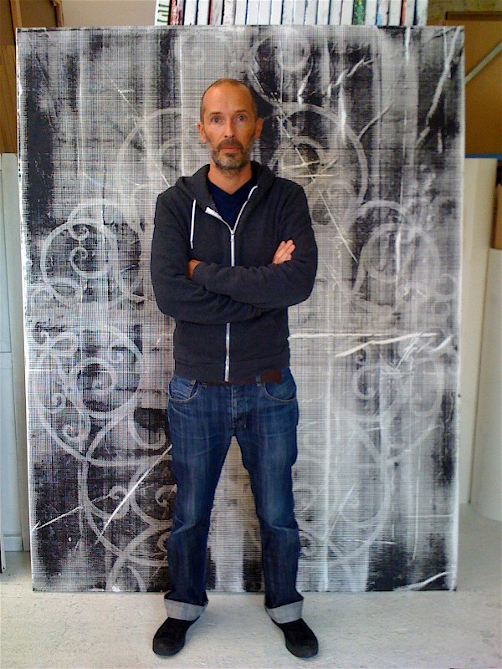 When I first visited the artist in Ivry-sur-Seine, a suburb just outside of Paris some years ago, I noticed a serious collection of plastic shower curtains, odd bits and pieces of bathroom hardware, and store-bought household items scattered about his studio. At the time, Fougeirol was using the curtains with their die-cut patterns to stencil and print all-over patterns on his canvases.