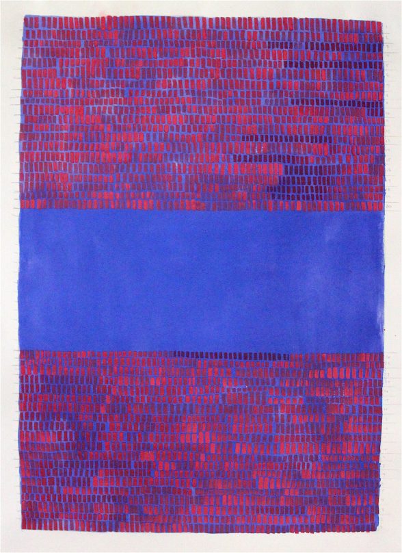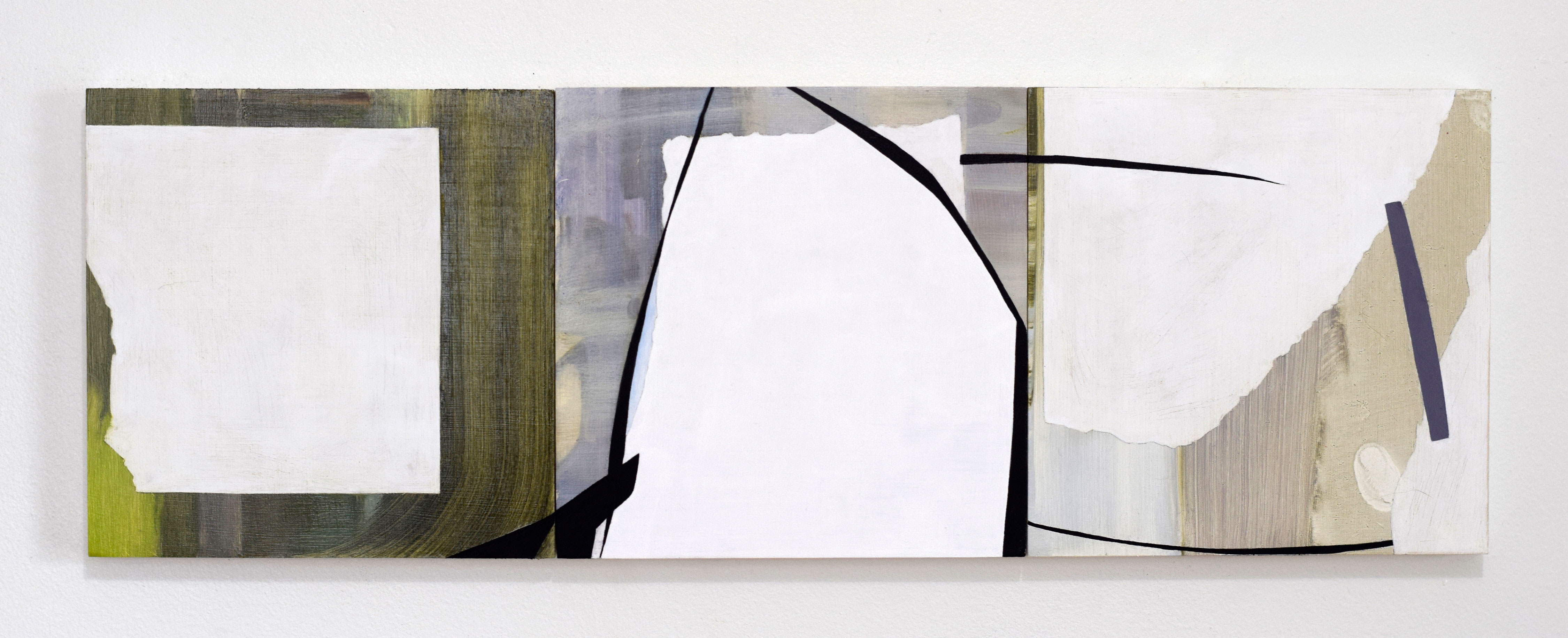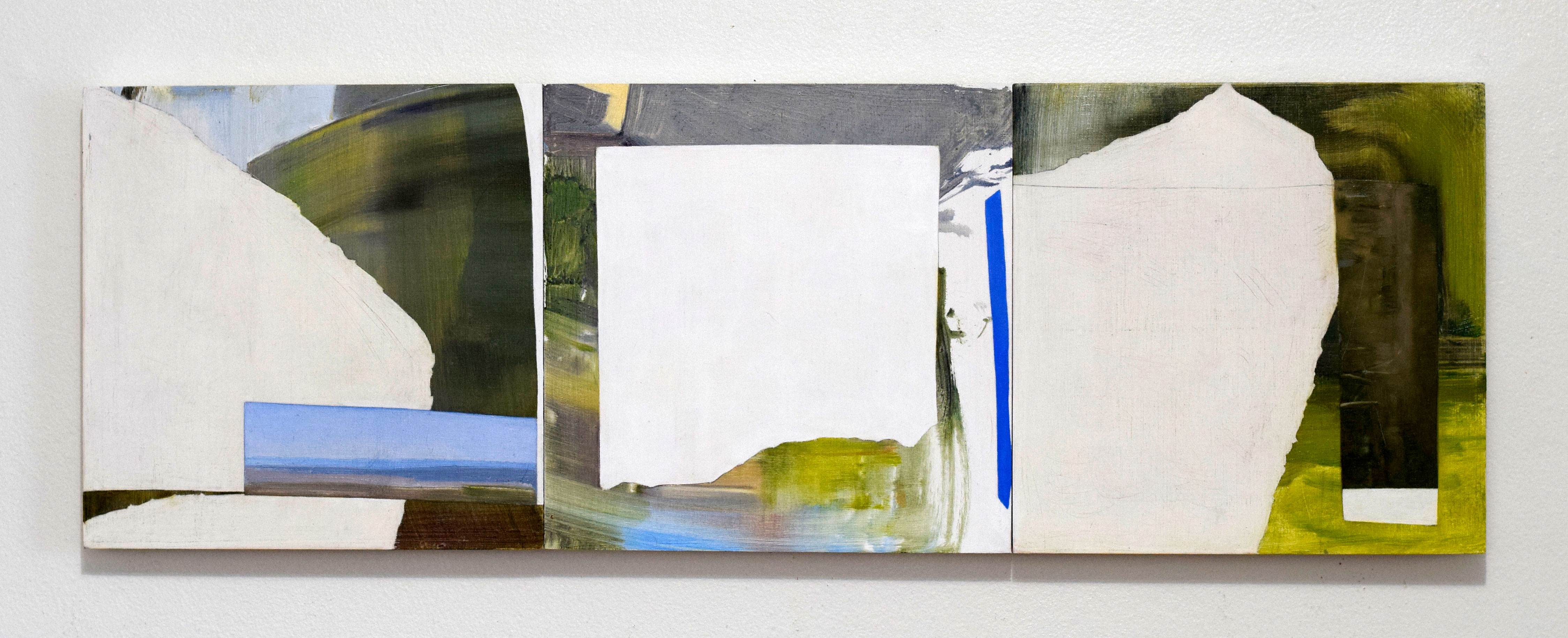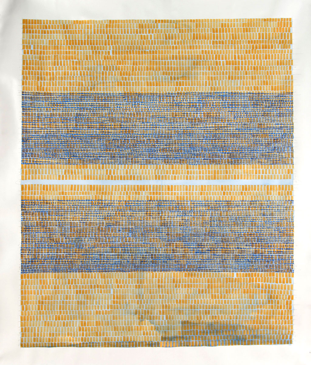 While, in the show, both artists wrangled with landscape, they also both have extended drawing practices around other subjects (see Clift’s Woman Drawings, and Mitchell’s Our Autonomy). In her most recent body of work, Mitchell depicts the wide, atmospheric spaces of the Oregon Playa with a tapestry of brush strokes. The marks rest against a careful grid, abutting, softening, and complicating the programmatic system those lines imply. Her subtle modulations of mark and color connote, without illustrating, the experience of a vast American landscape. Clift’s landscapes also utilize abstraction, but they feel intimate. On small panels, she paints the shallower space of a backyard — a garden, a fence, a hallway, a lawn — collaging plein air elements and carefully sanding the surfaces to expose sections of gesso. The resulting paintings are constructed with abstract forms that resist definition, yet feel incredibly specific.
