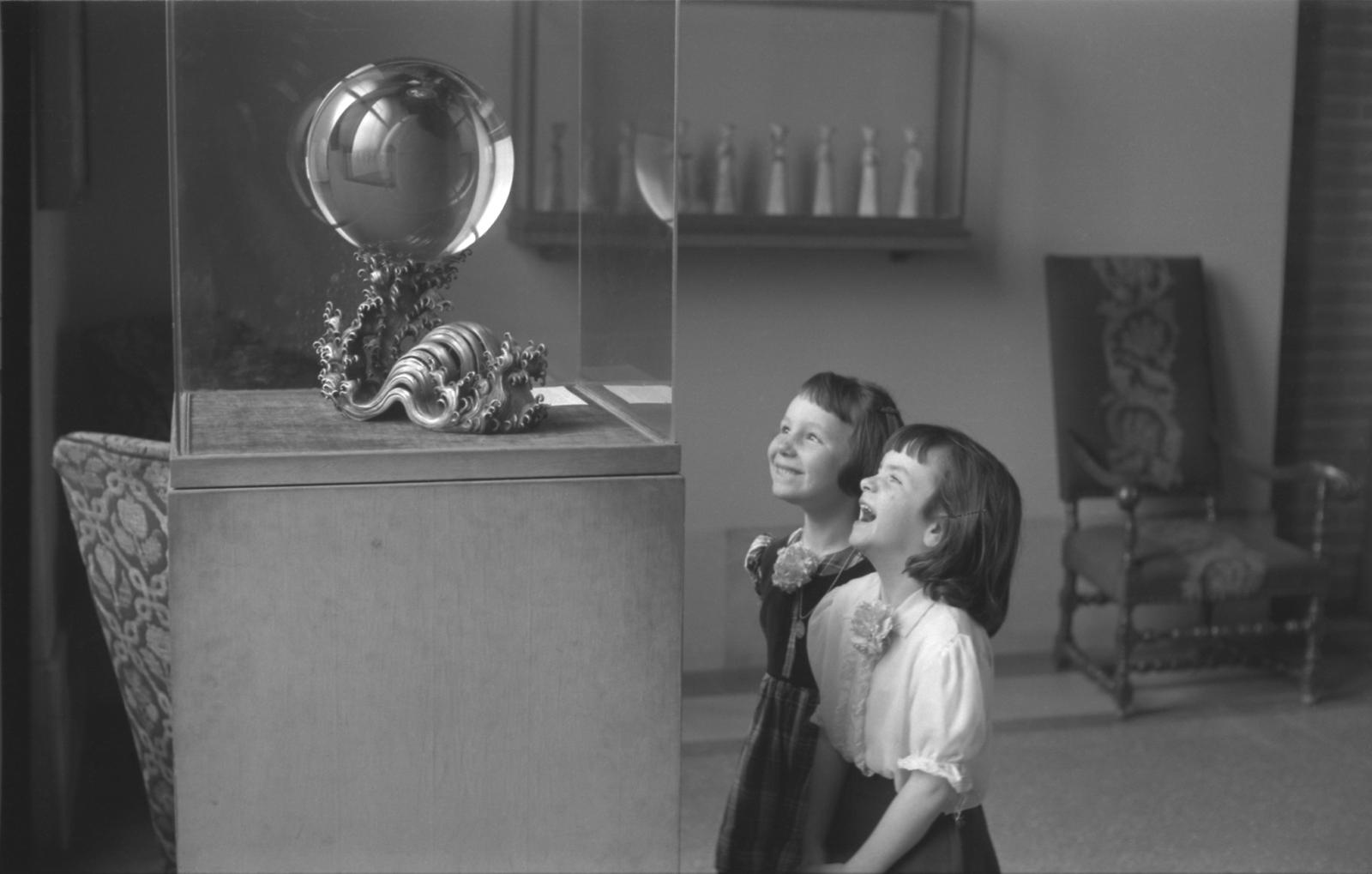 The day I visit there is a school group in the gallery. The school kids are at a cusp-age, their heights varying by feet. The teacher is taking a photo of a kid in a finger splint gesturing at the ball, proffering it.