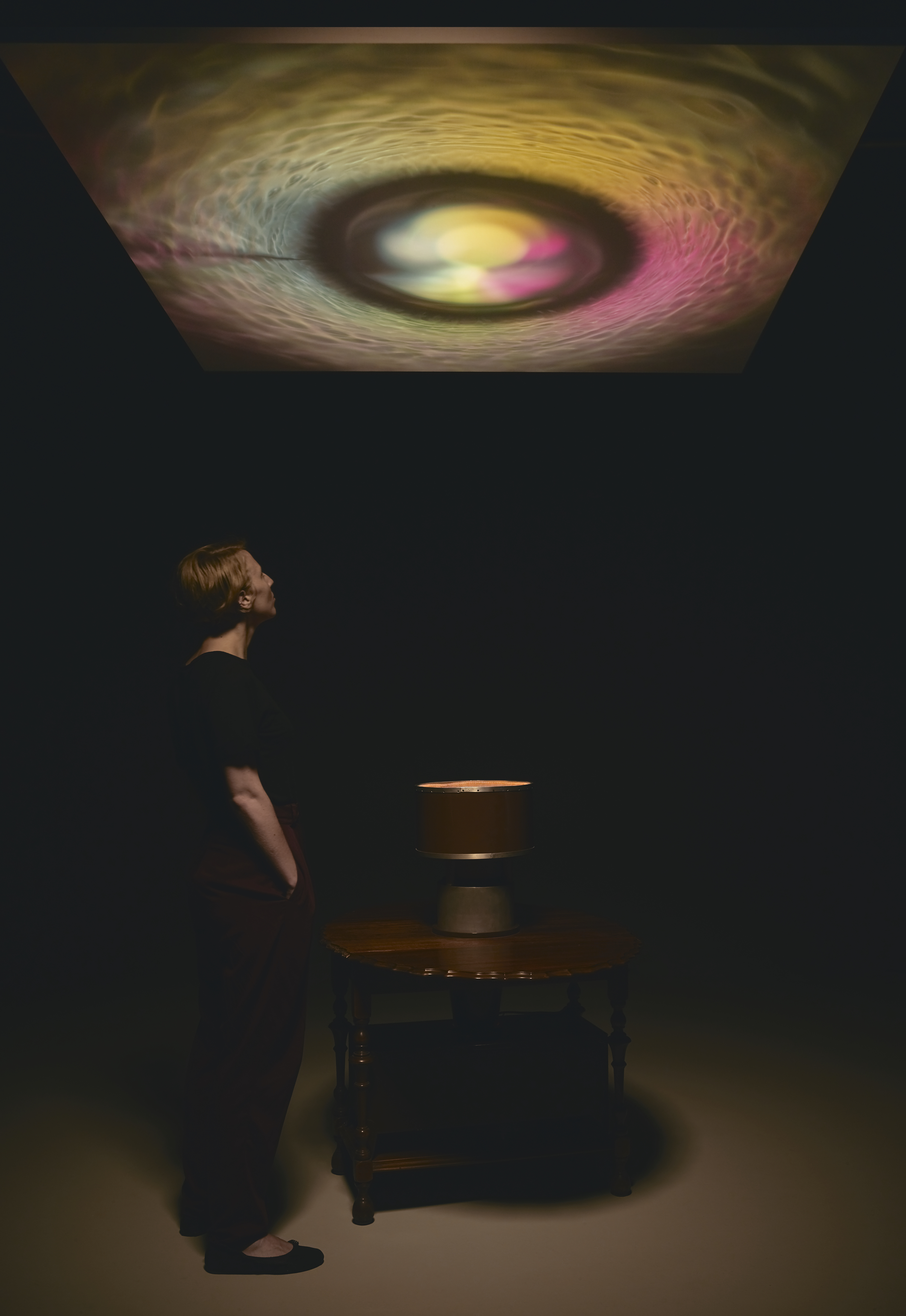 The Lumia create ghostly forms in slow motion (barring a single, still piece) that appear to be floating in space and morph over time; he produced a variety of effects from one work to another. They run through cycles that vary from several minutes to many years and it is easy to be seduced into a timeless state by their growth-like patterns. The most spectacular of the domestic Lumia has an unwieldy title: “Unit #50, Elliptical Prelude and Chalice,” from the first Table Model Clavilux (Luminar) series (1928). In contrast to all the others, which project light onto screens mounted in cabinets or on the wall, this projects light onto the ceiling above a table which contains the lighting, reflectors and moving parts.
